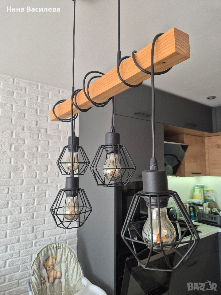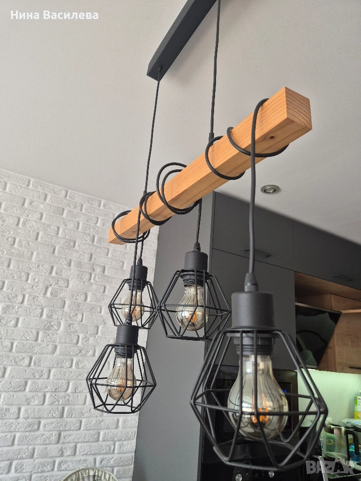 Висящ полилей с дървена основа и декоративни метални абажури. Подходяща за поставяне над трапезна маса или барплот. Комбинацията от дърво и метал създава модерен и индустриален стил. Без забележки. Бургас, Славейко.