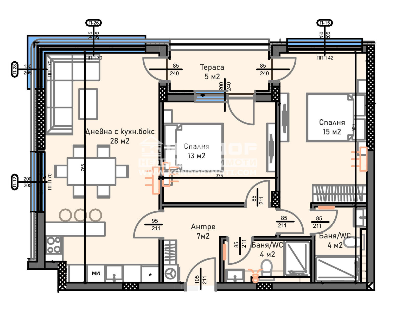 Оферта 68933 - Предлагаме Ви възможността да избягате от градската динамика и да се насладите на спокойствието на къща, но с удобството и лесната поддръжка на апартамент, закупувайки жилище в един от най-новите жилищни комплекси в периферията на града. Жилището се състои от ъглова дневна 28кв.м. с кухненски бокс, две самостоятелни спални: родителска 15кв.м. със собствена баня, детска 13кв.м., втора баня с тоалетна, входно антре с място за перално и една обща тераса. Комплексът се състои от две модерни нискоетажни сгради, с функционално разпределени апартаменти, предвидени Гаражи и Паркоместа. Проектът се изпълнява от инвеститор с дългогодишен опит в строителството и богато портфолио от успешно реализирани проекти. Отличната локация, съчетана със спокойствие, чист въздух, панорамни гледки и бърз достъп до града правят имота подходящ както за лично ползване, така и подходящ за сигурна инвестиция с висока възвращаемост. Възможност за покупка на разсрочено плащане в рамките на строителството, както и вариант за Банково финасиране на изключително изгодни условия !!!