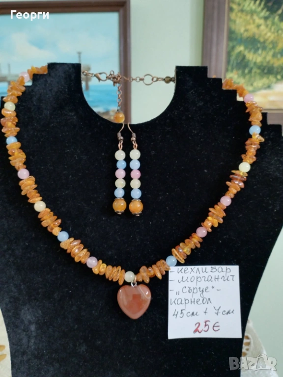 Красив дамски комплект бижута от естествени камъни – кехлибар, морганит и карнеол, завършен с нежна висулка сърце. Топлите златисти нюанси на кехлибара се съчетават перфектно с меките пастелни цветове на морганита и ефектния карнеол, което придава изключително стилна и женствена визия.