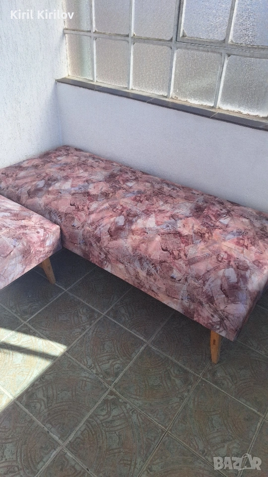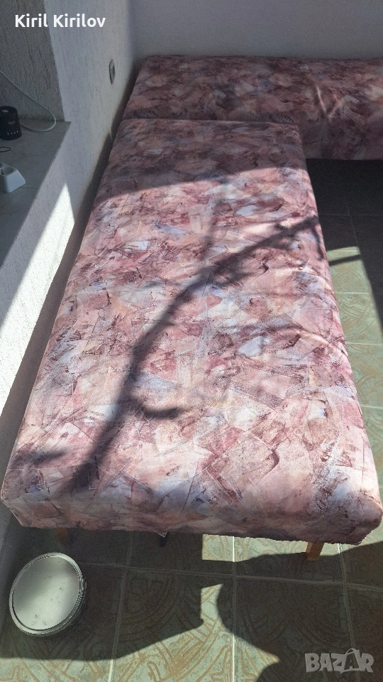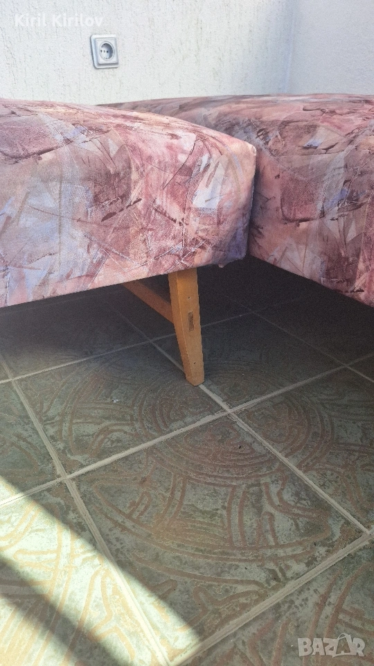 Две легла на крака, покрити с декоративна тапицерия в розово-кафяви цветове. Подходящи за малки помещения или като допълнителни легла. Подходящи и за тераси като ъглов диван.Здрави, без забележки. Размери 185/80. Цената е 15 евро на легло.