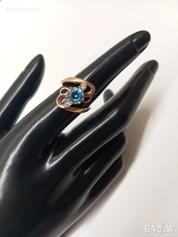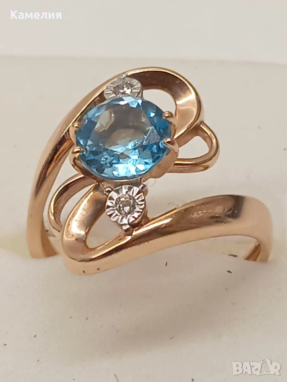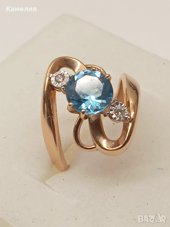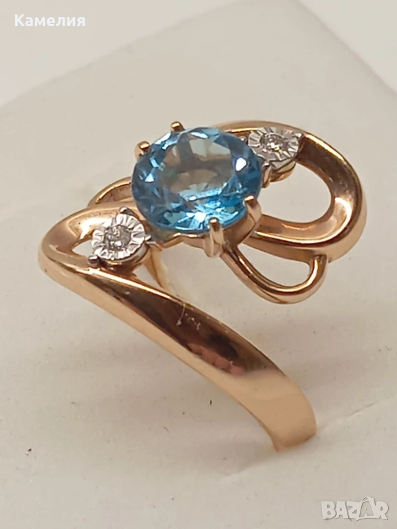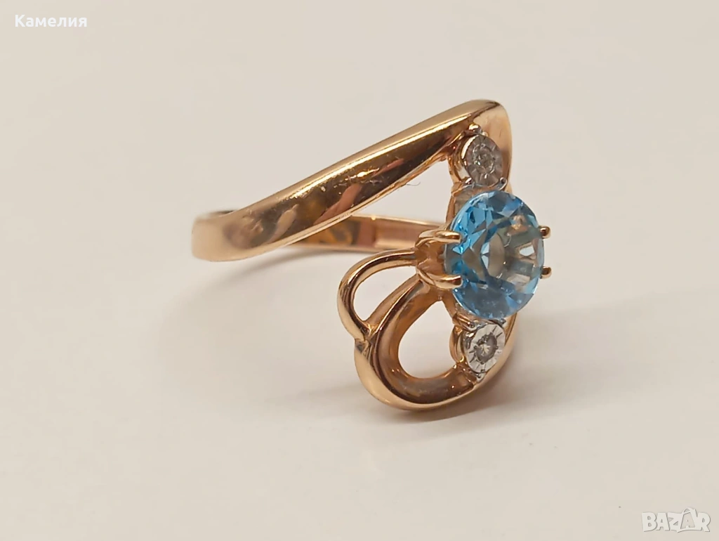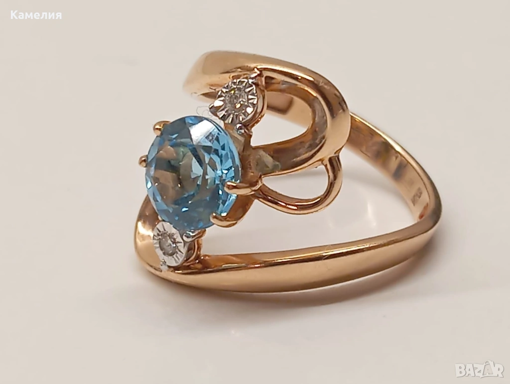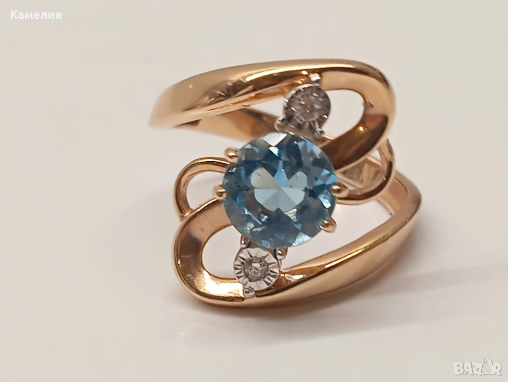 Руски златен пръстен с топаз и брилианти . Проба 585 глава с кокошник. Грамаж 3,23 грам. Диаметър 17 мм.