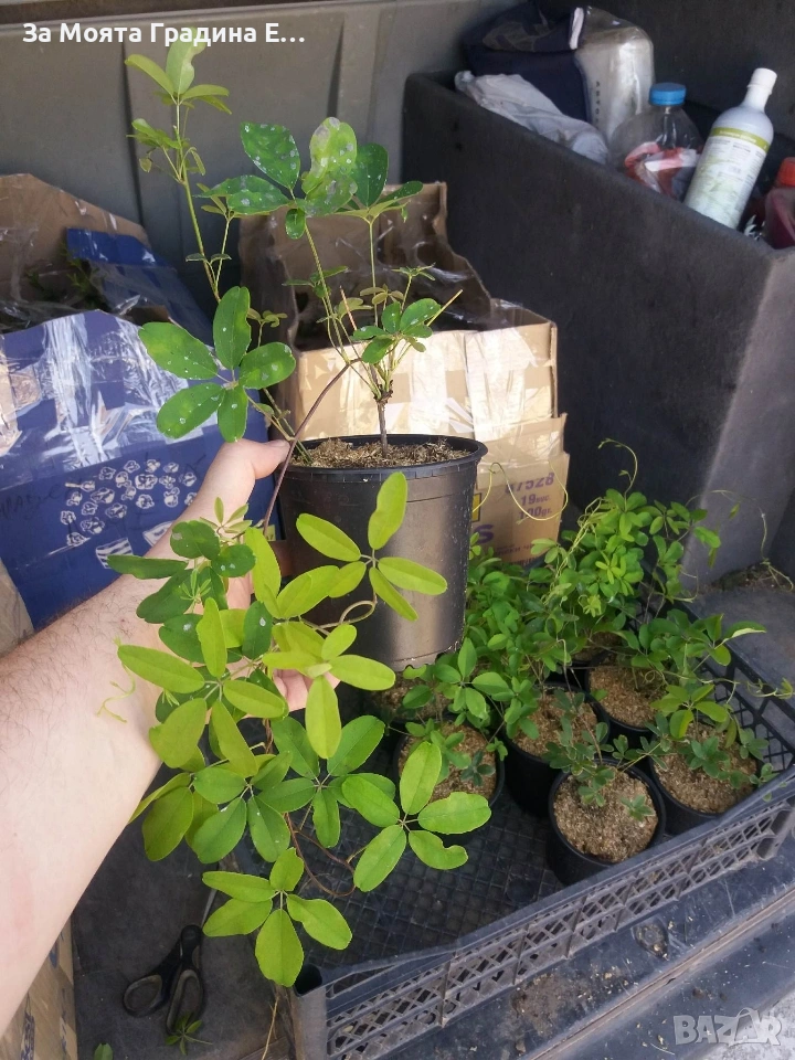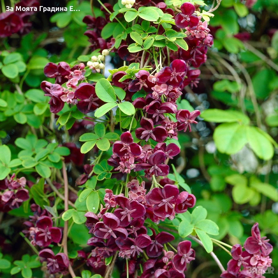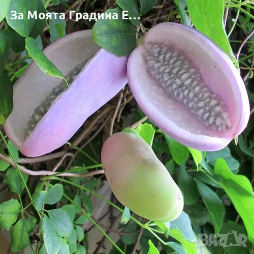 Акебия / Шоколадова лоза (Akebia quinata) – Екзотично ядливо растение 🌿 Цена: 1 бр – 12,50€ 🍇 За плододаване: нужни са минимум 2 растения Описание: Бързорастяща увивна дървесна лиана с ароматни шоколадово-лилави цветове (≈3 см), които през нощта се обогатяват с ванилов аромат. Плодовете са лилаво-виолетови, плоски и продълговати (5–10 см), с мека вътрешност и малки черни семки – сладки на вкус и подходящи за консумация или приготвяне на здравословни лекарства. Отглеждане: Вирее в сенчести и влажни места, предпочита леки песъчливи до кални почви. Може да расте както в киселинна, така и в алкална среда. Обича шарена сянка, но се адаптира и към по-топли условия. Издържа до -20°C и при мека зима е полу- или вечнозелена. Достига зрялост за около 5 години. Ползи и употреба: Плодовете са ядливи и се използват в медицината срещу ракови заболявания. Младите филизи – за салати и консерви. Листата могат да заместят чая. Вътрешността на стеблата – за лечение на пикочния тракт. Коренът е антипиретик – може да се използва за понижаване на температурата. 🌱 Идеално екзотично растение за градина или балкон, което ще впечатли с красотата и ароматa си! Растенията са в контейнери, което позволява засаждането им да се извършва почти целогодишно. Много от растенията променят вида си през периодите на своята вегетация, но тук в сайта със снимки се представят в най-атрактивния им вид. Повечето снимки в сайта ни покзват как ще изглеждат растенията след определен период и положени необходимите грижи.