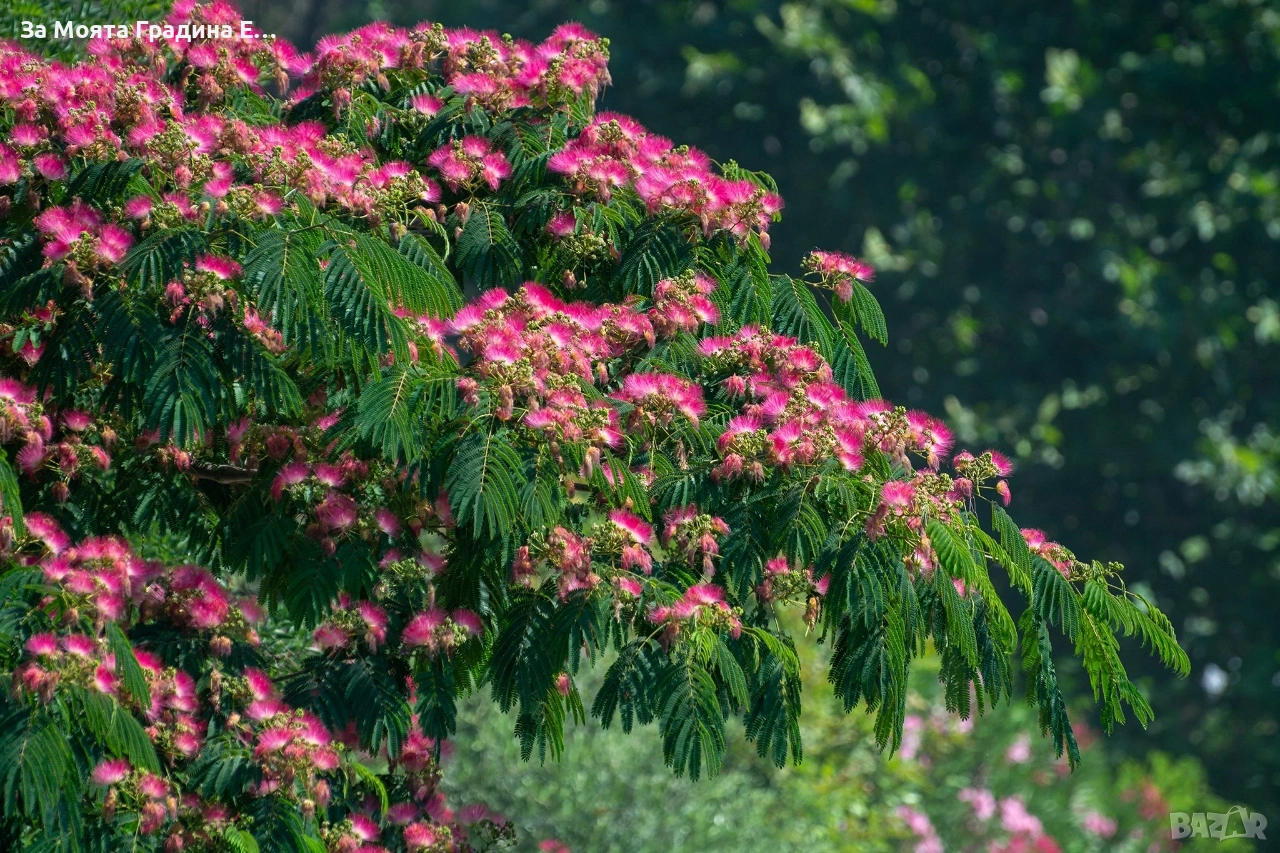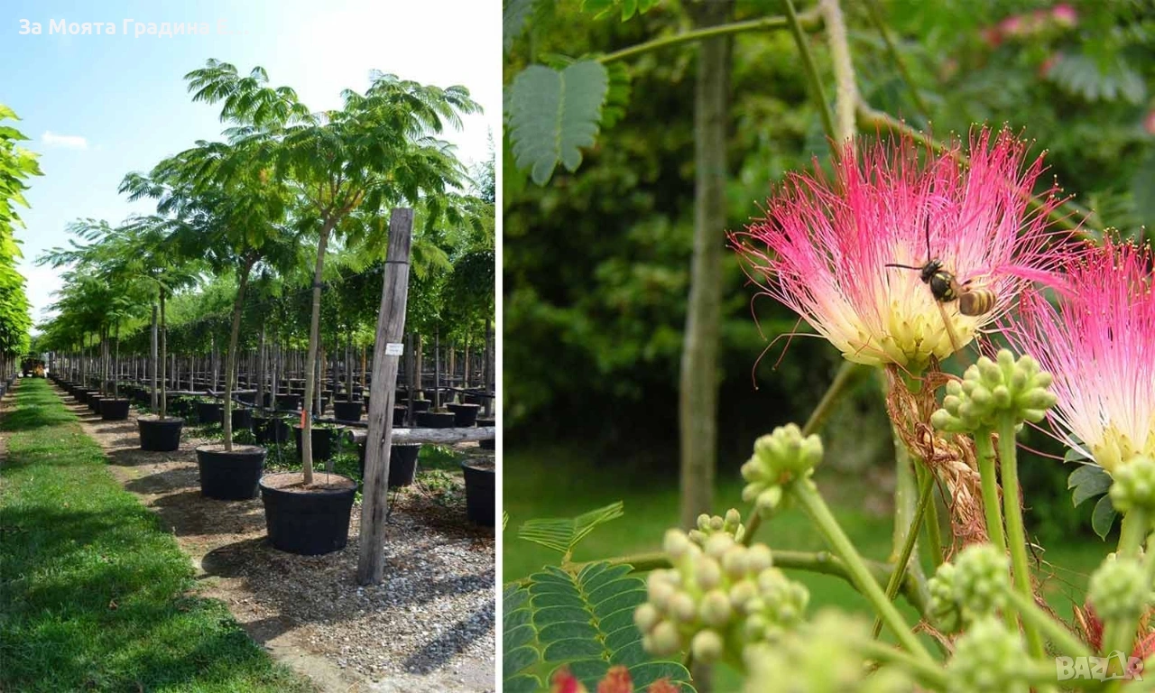 Размер около 100см за 18 € Размер 180-200см за 24 € Албицията е широколистно дърво – с опадливи листа Достига до 10 м. височина Цъфти юли – септември с дълбоко розови цветове Студоустойчив Гарантирано качество Произведено в България Албицията е средно на размер дърво с опадващи листа, с корона с чадъро-образна форма. Обича по скоро сух и слънчев климат отколкто обилна поливка. Албицията е светлолюбива и не може да вирее в сянката на други дървета. Разлиства се сравнително късно – в края на Април, когато всички други дървета вече са разлистени. Цъфти обилно и продължително, започвайки от средата на Юни до Септември-Октомври. Цветовете се затварят през ноща и се отварят отново сутринта. През Есента листата се запазват свежи и зелени доста дълго – до края на Ноември или до падането на първия сняг. Използва се за единично и групово засаждане в градината Растенията са в в контейнери, което позволява засаждането им да се извършва почти целогодишно. Много от растенията променят вида си през периодите на своята вегетация, но тук в сайта със снимки се представят в най-атрактивния им вид. Повечето снимки в сайта ни покзват как ще изглеждат растенията след определен период и положени необходимите грижи.
