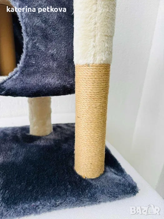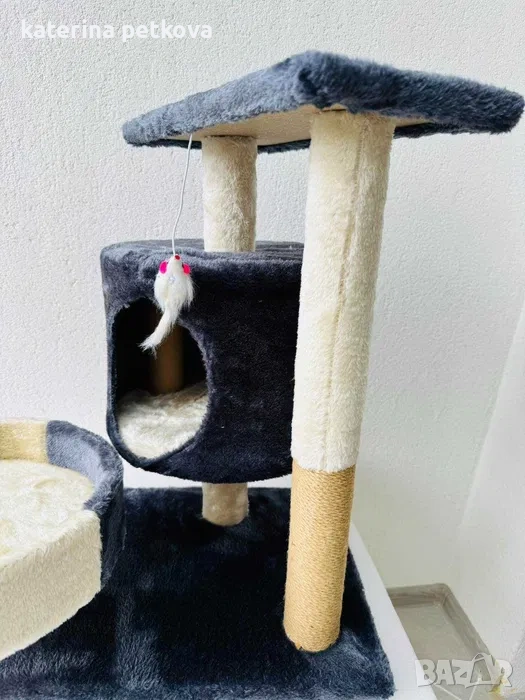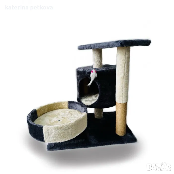 Стилно котешко дърво с всичко необходимо за щастливо коте! Уютна хралупа за спокойни дрямки, меко легло за релакс и удобна чесалка за поддържане на ноктите – стилно решение за комфорт и забавление у дома.