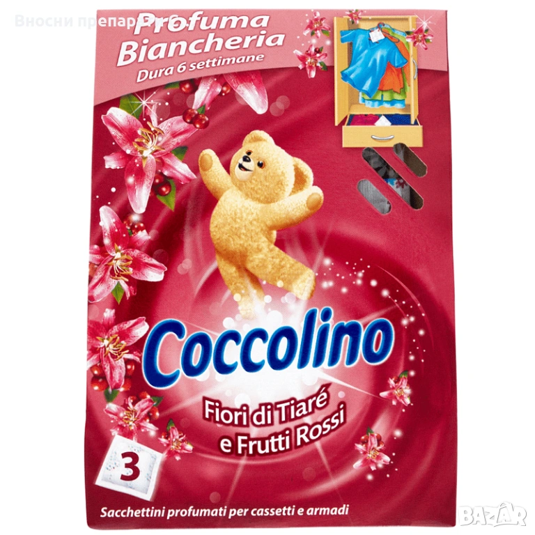 Новите ароматизирани сашета за гардероб, чекмеджета или дрешници на Coccolino запазват аромата за повече от 6 седмици, като своевременно придават приятен и чуствен аромат на плодове по дрехите и бельото Ви.