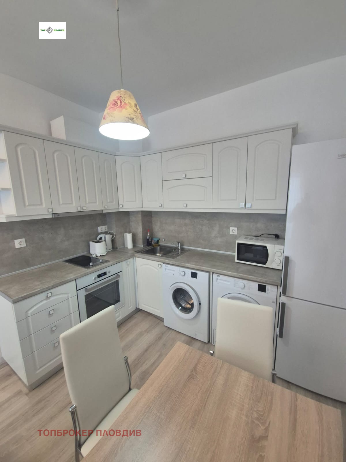 - Просторна дневна с обособен кухненски бокс, оборудван с готварска печка, котлони, микровълнова, хладилник и абсорбатор.