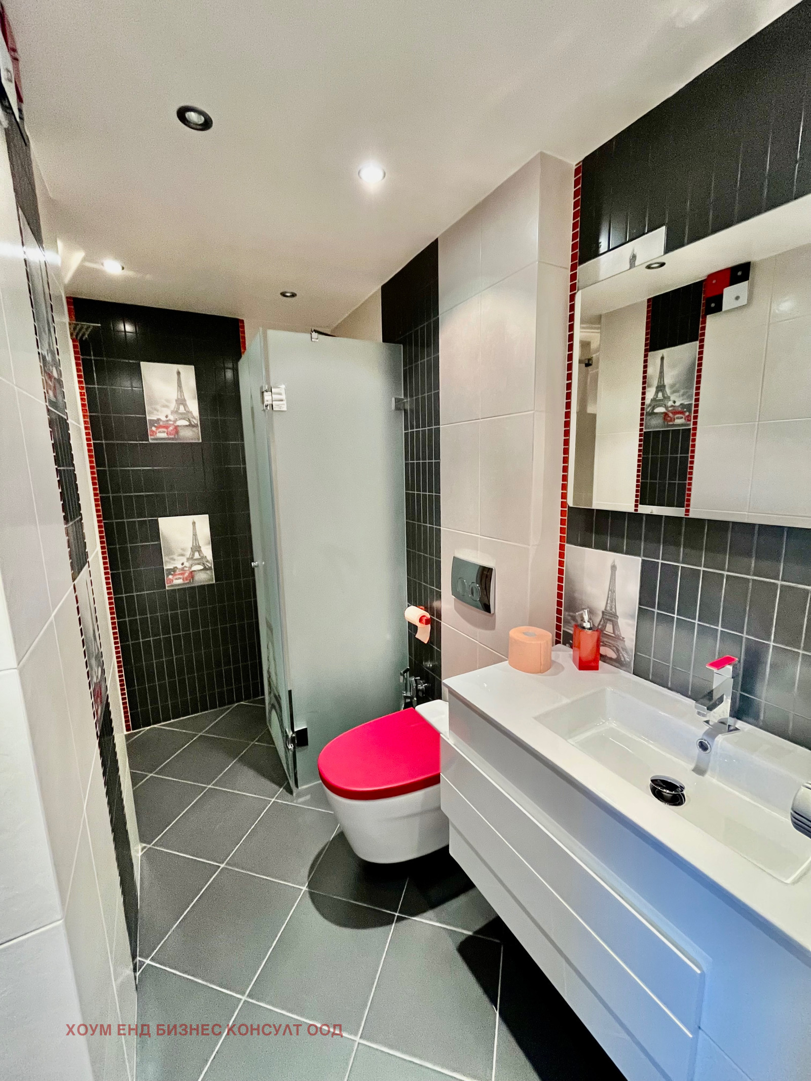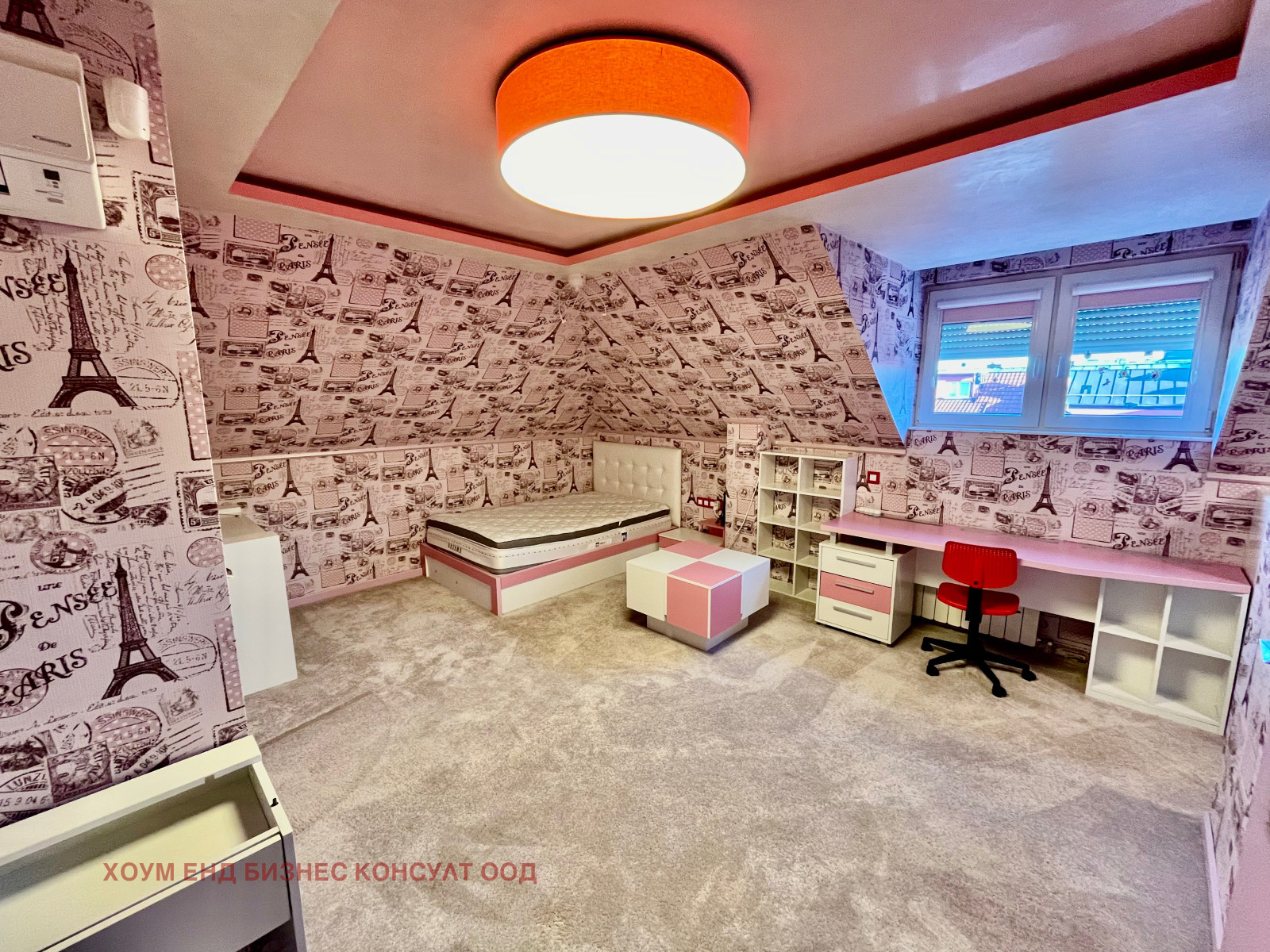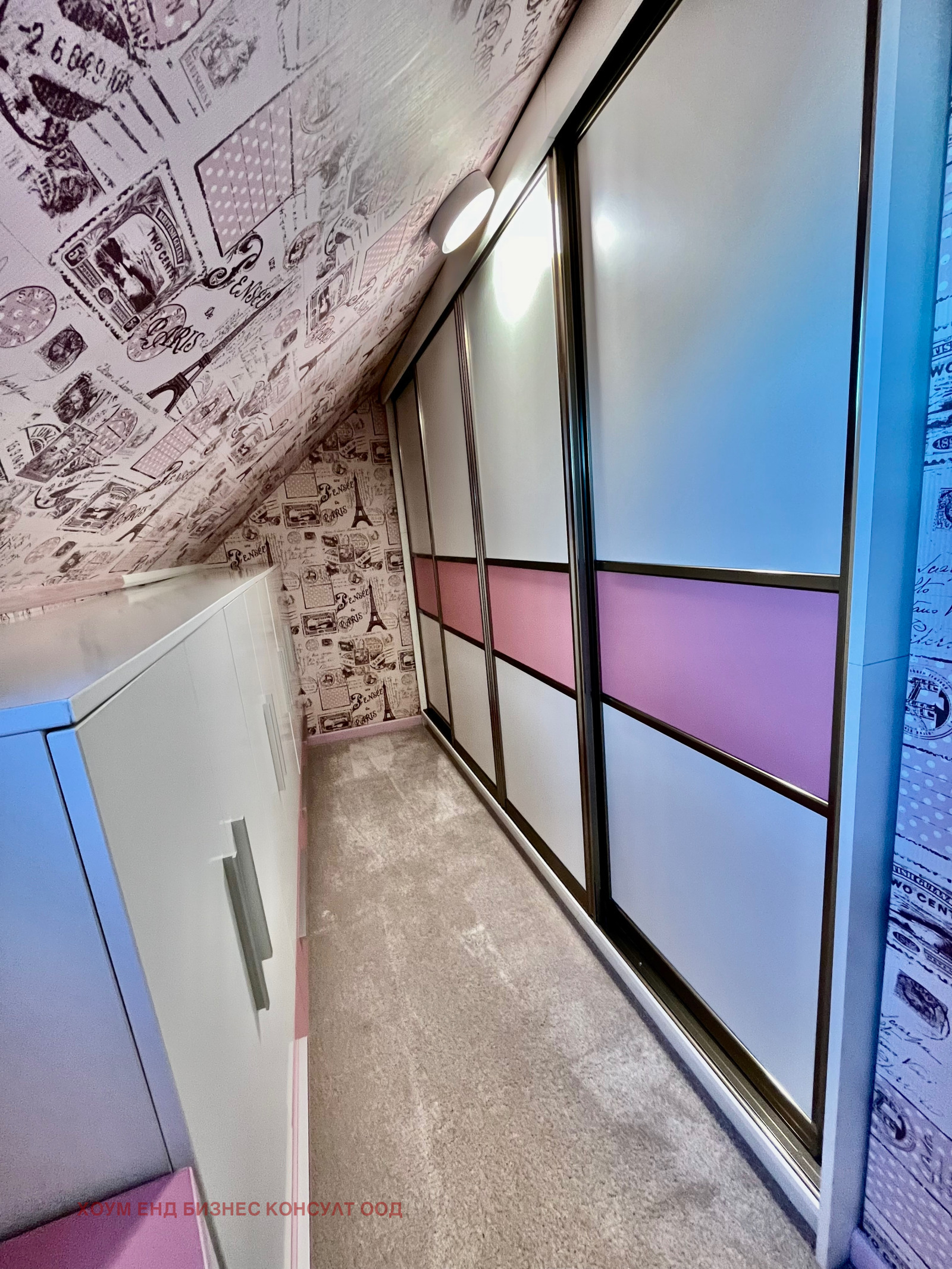 - Второ ниво - детска стая - напълно обзаведена със спалня персон и половина, бюро секции и големи гардероби, прилежаща баня с тоалетна и тераса.
