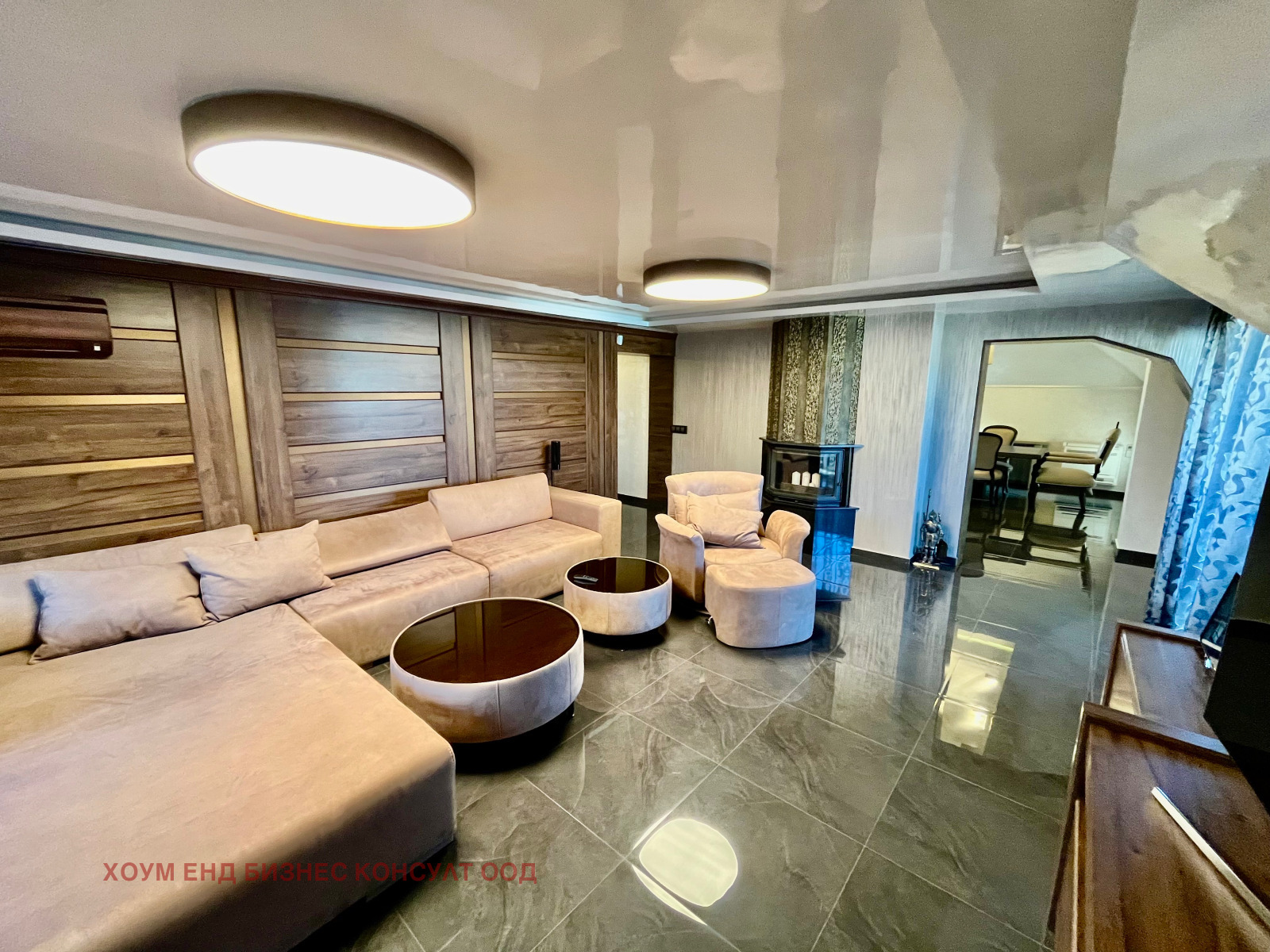 - Първо ниво - коридор, тоалетна за гости, мокро помещение с пералня и сушилня, хол с мека мебел, камина/функционираща/, секционен модул, телевизор и озвучителна система, голяма трапезна маса с 6бр. столове, напълно оборудвана кухня - печка, хладилник, микровълнова, съдомиялна. Родителска спалня с прилежаща гардеробна и самостоятелна баня с тоалетна. Голяма тераса с градински мебели.