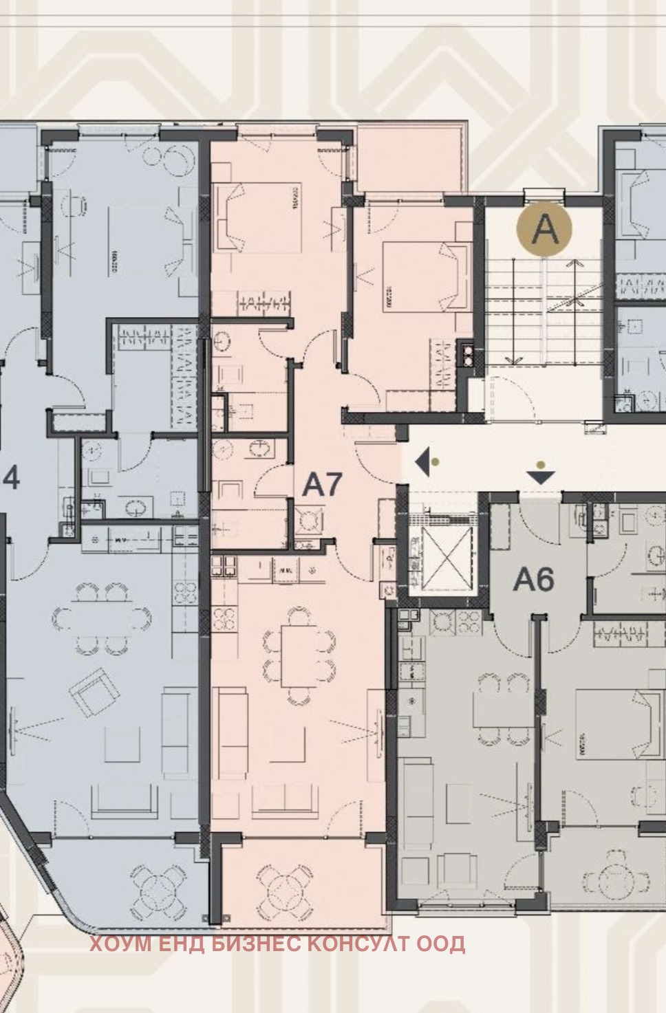 Ап. А7 - разполага с две спални, дневна с кухненски бокс, вде бани с тоалетна, коридор, 2 тераси, намира се на ет.2, с чиста застроена площ от 91.82 кв.м, с 12.95 кв.м общи части. Можем да Ви предложим и други подобни апартаменти на различни етажи.