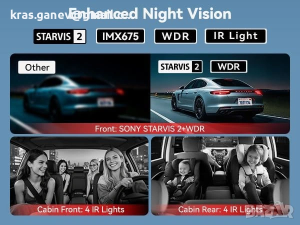 STARVIS 2 и двойно инфрачервено нощно виждане: При видеорегистраторите, ясният запис при условия на слаба светлина е от първостепенно значение. Предната камера на REDTIGER F17Plus разполага със сензор STARVIS 2 за записи с ултрависока резолюция при слаба светлина, идеални за заснемане на регистрационни номера и детайли на пътя през нощта или в тунели. Както предната, така и задната камера използват инфрачервено нощно виждане, така че спящите деца, домашни любимци или пътници могат да бъдат наблюдавани на тъмно без видима светлина. Независимо дали шофирате през нощта или сте паркирали, тази видеорегистратор ясно заснема регистрационните номера и пешеходците.