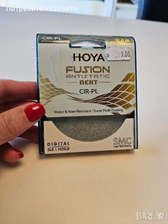 Това е кръгов поляризиращ филтър (CIR-PL) с марка Hoya, модел Fusion Antistatic Next.