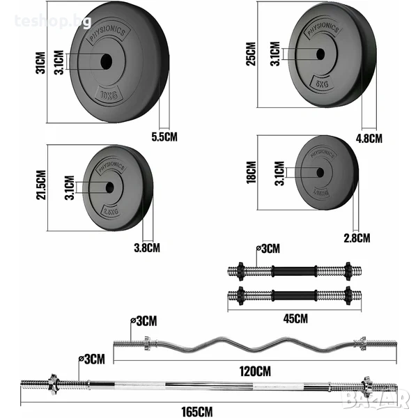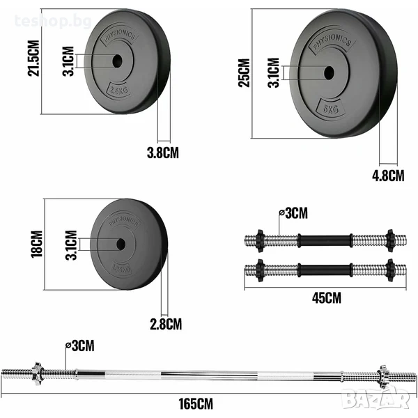 Комплект от 2 щанги + 2 дъмбели и плочи, 38 кг PHYSIONICS → Обява 53745814