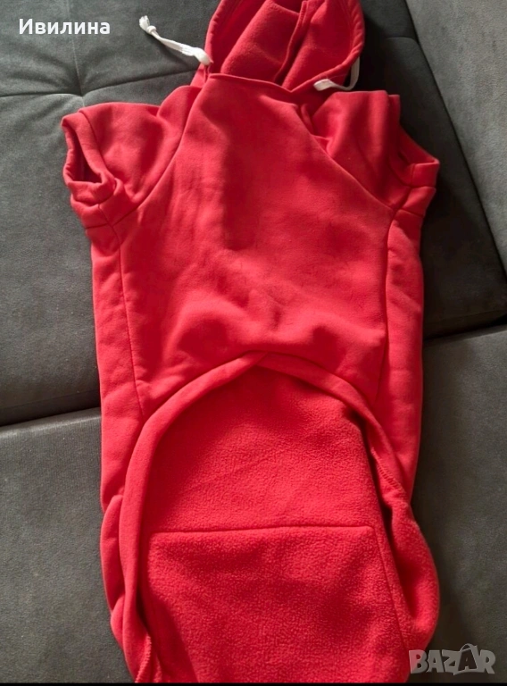 Дрехата е червена. Суитшърт с джобче, с цип на гърба. Размерите са: