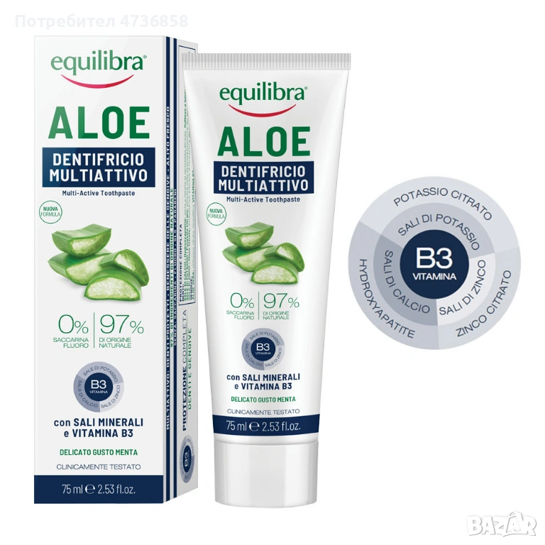 Equilibra Aloe Multi-Active е мултиактивна паста за зъби, разработена с 97% съставки от естествен произход и еквивалент на 30% Алое вера. Формулата е създадена за нежна, но