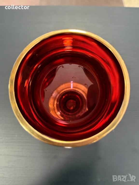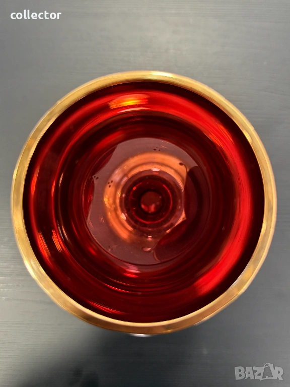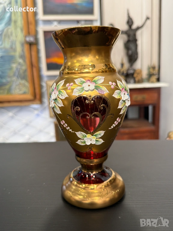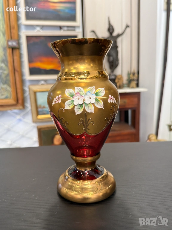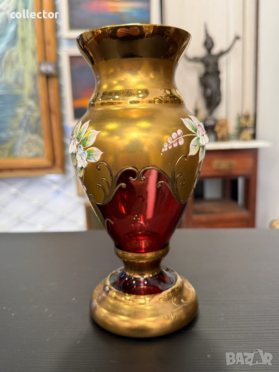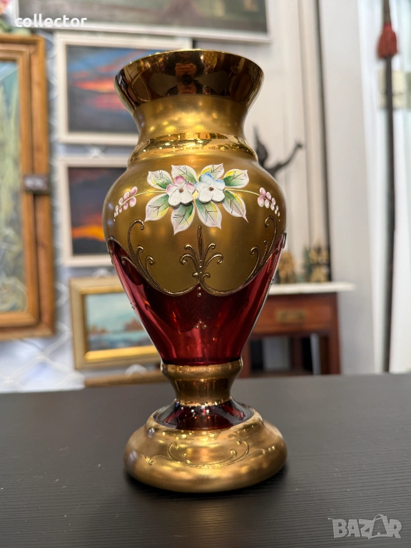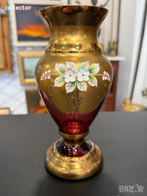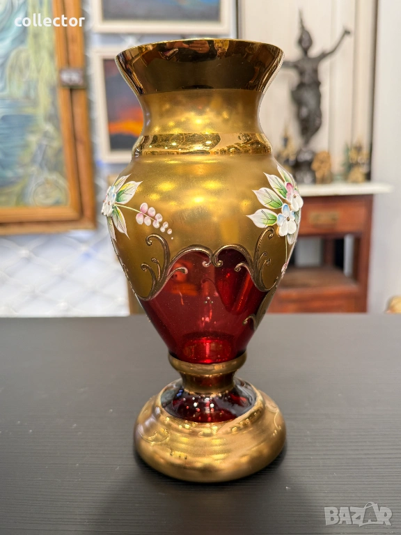 Използва се прозрачно розово стъкло, което е по-светло и нежно в сравнение с наситеното рубинено червено. Обвита от обилна 24-каратова позлата и ръчно рисувани емайлирани цветя.