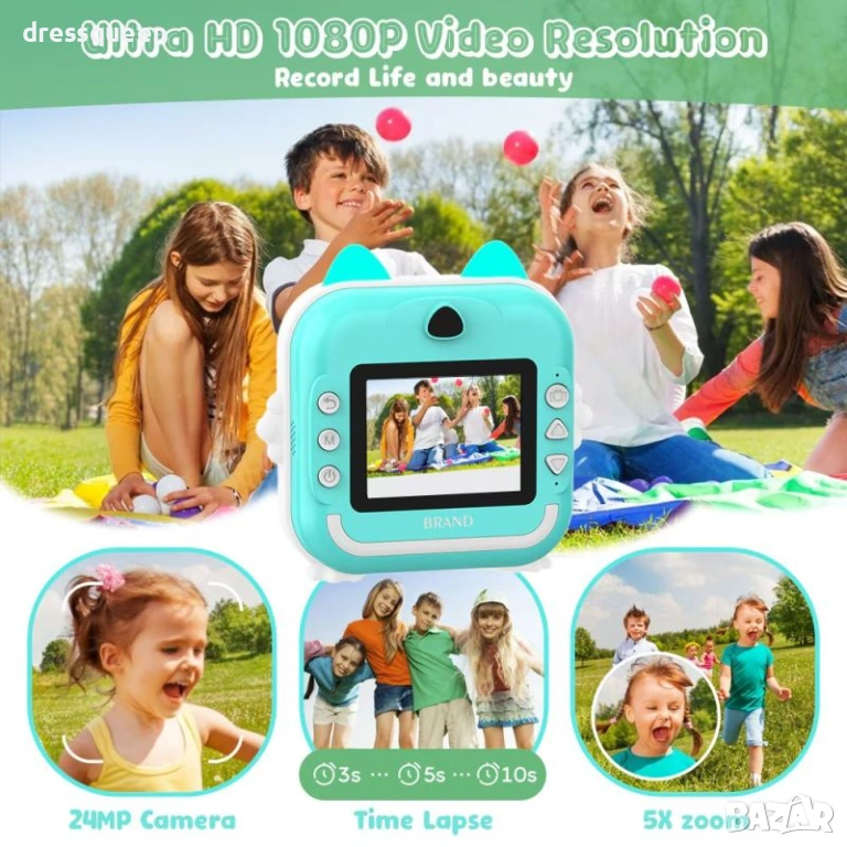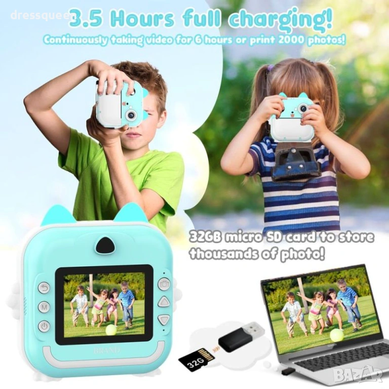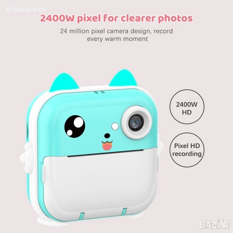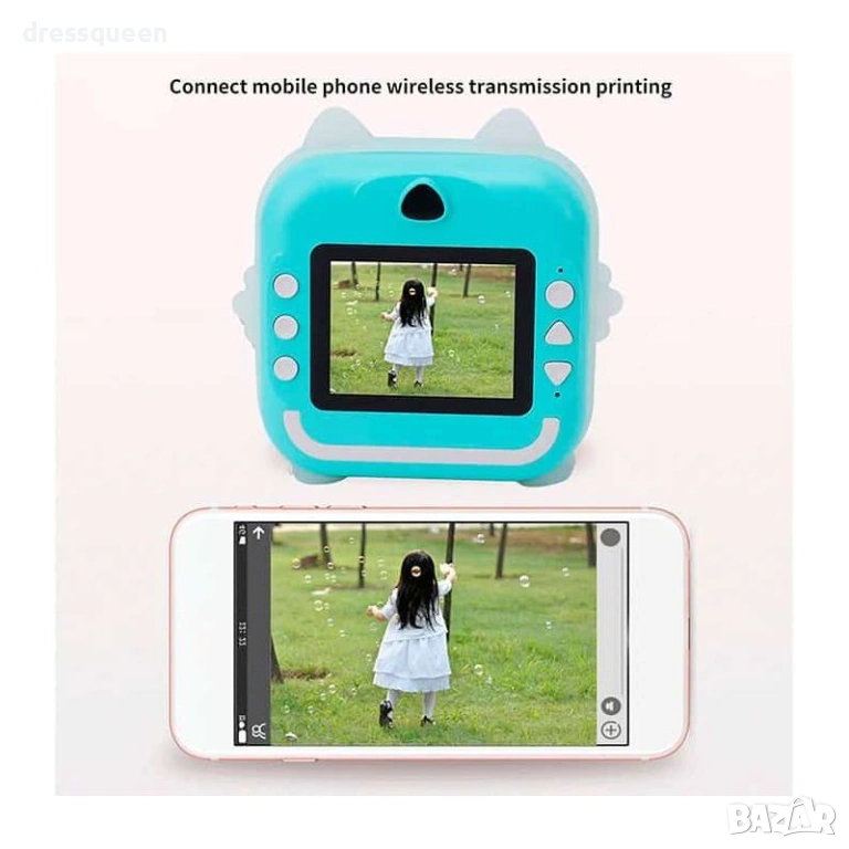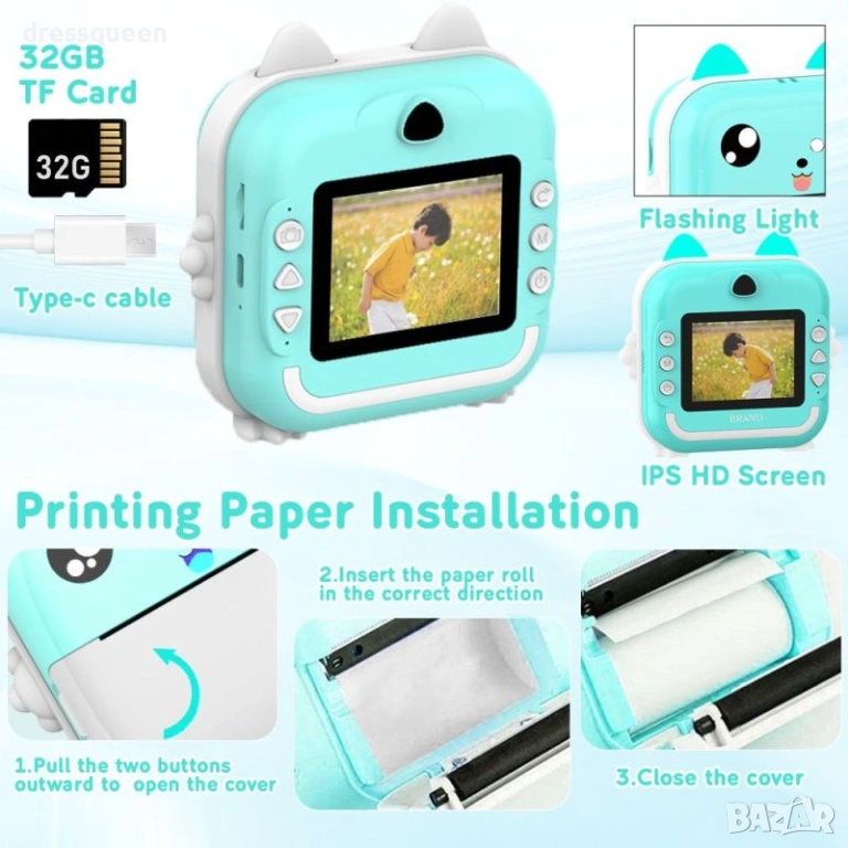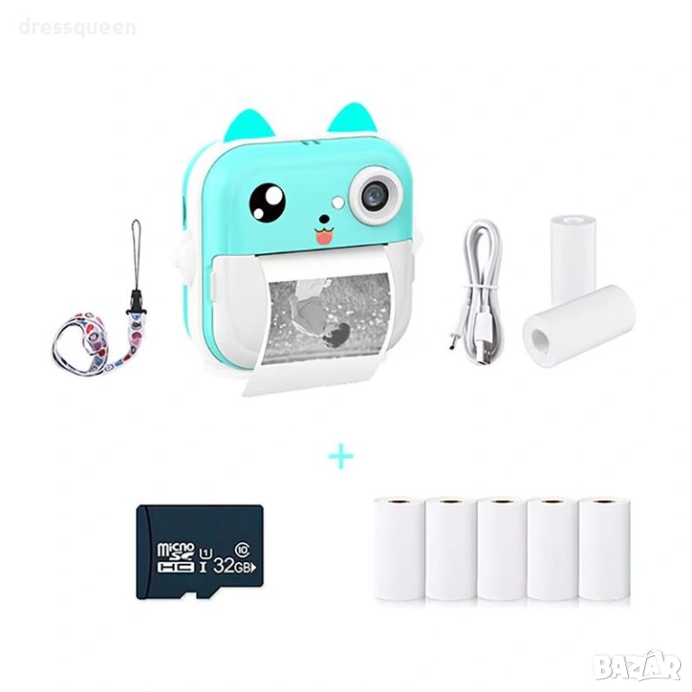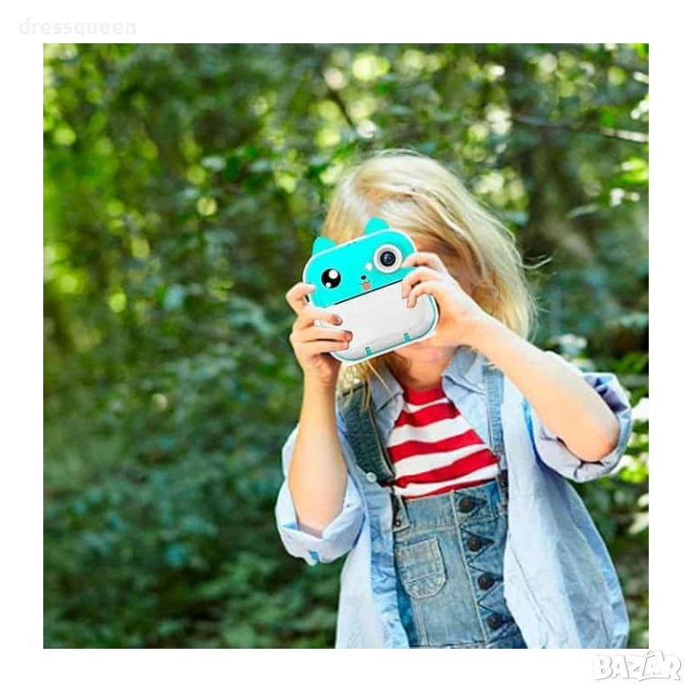 Зелената детска камера с термопринтер е високотехнологично устройство, създадено да развива креативността на Вашето дете! Оборудван с 2.4-инчов IPS дисплей и двойна камера, фотоапаратът прави до 1500 моментални снимки с едно зареждане (3 ролки хартия са включени). Bluetooth свързаността позволява лесно споделяне на снимки и използване на приложението FUN PRINT. Добавете фото рамки, филтри и декоративни шаблони, за да направите всяка снимка уникална!