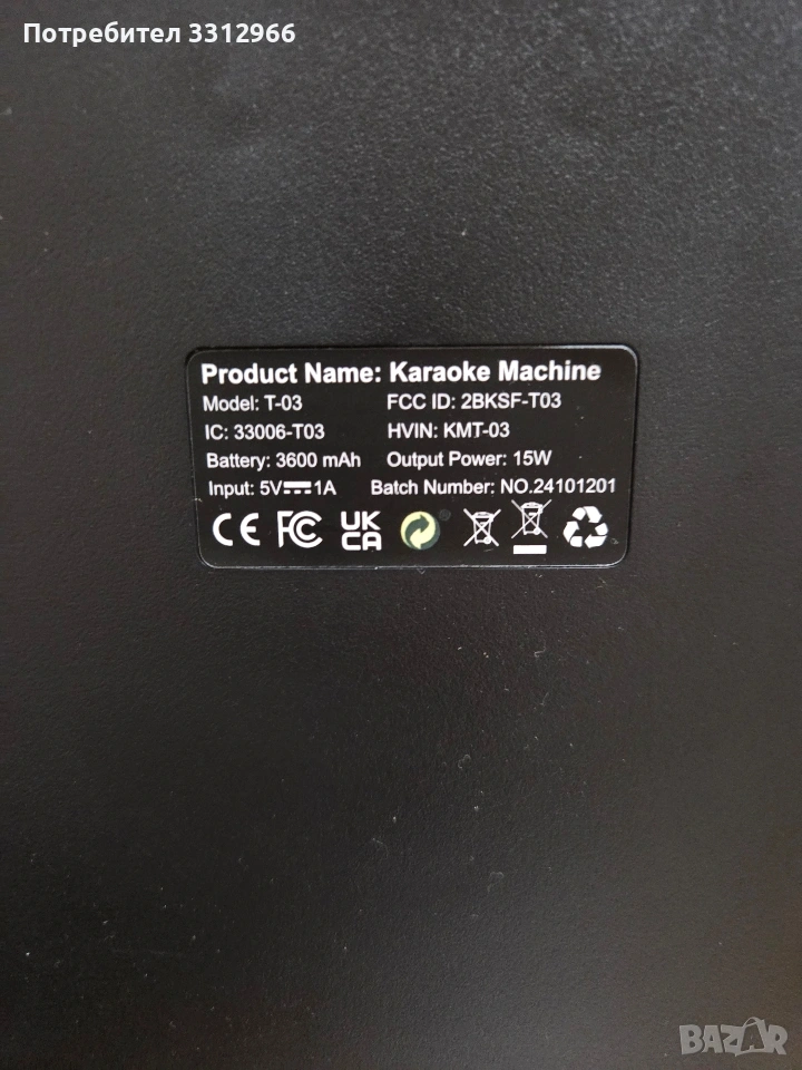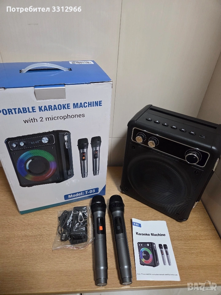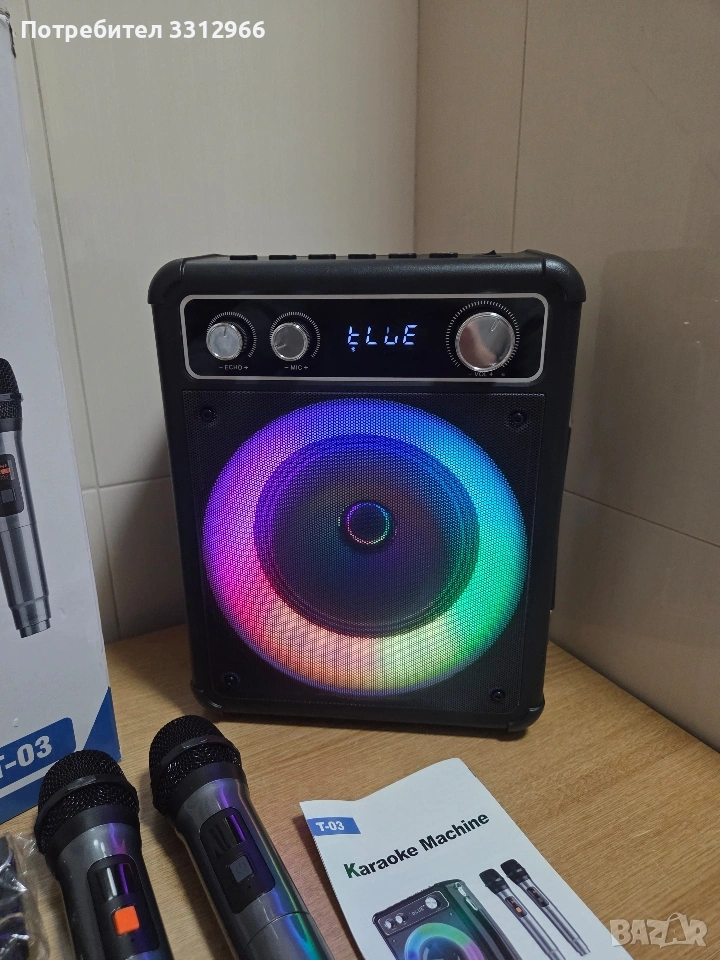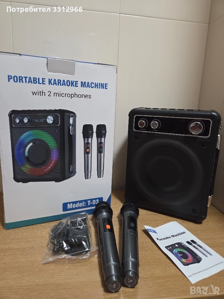 Чисто нова блутут караоке колонка Vosoco T-03 с два безжични микрофона. LED светлинни ефекти, които пулсират в ритъма на музиката. Включва два безжични микрофона за дуетни изпълнения. Разполага с Bluetooth връзка за безжично поточно предаване на музика. Мощността на високоговорителя е 15 вата.