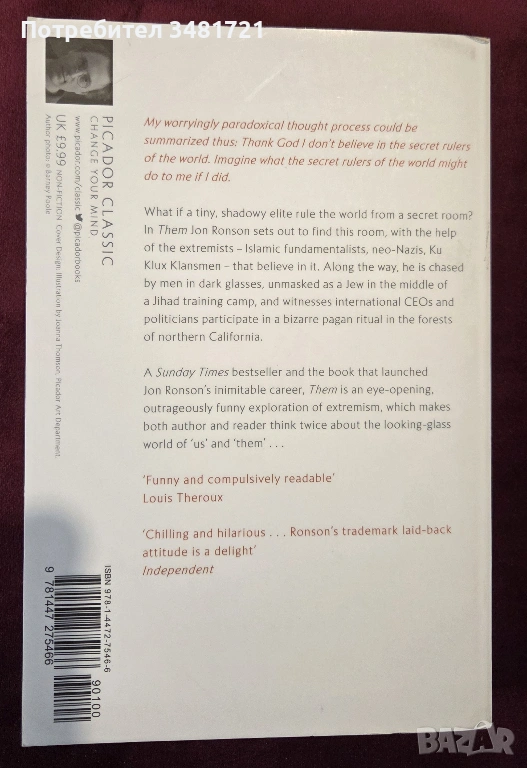 Комична, но и злокобна, това е историята на неговото търсене. История, в която той ще бъде преследван от мъже с тъмни очила, разпознат като евреин в лагер за обучение на джихадисти, както и зрител на езически ритуал, извършван от политици и международни директори на компании, в горите на северна Калифорния. Това е едно грабващо вниманието пътешествие из дебрите на екстремизма, в което авторът и читателят ще научат обезпокоителни неща за начина, по който "ние" и "те" гледаме на света. Дали пък екстремистите не са на прав път в теориите си? Или пък Джон просто е станал един от тези в сянка?