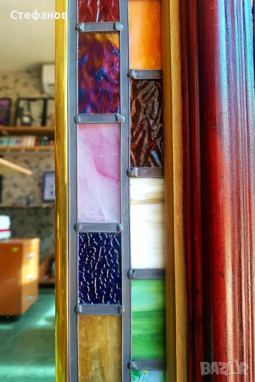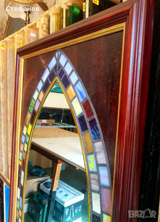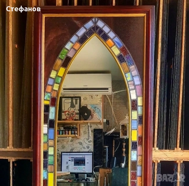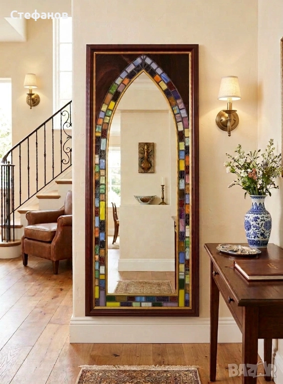Превърнете дома си в пространство с характер и изтънченост. Огледалото с формата на уникална арка в готически стил, е обгърнато от цветна мозайка с арт стъкло. Всеки детайл от класическия витраж е внимателно подбран, изработен с шпросни и опалесцентно художествено стъкло. Рамката е от масивно дърво в дълбок и топъл цвят махагон, който придава тежест и благородство на изделието. Със своите големи размери от 160х59 cm, това огледало предлага отражение в пълен размер, което е идеално за фоайе на хотели, за дневна, спалня или луксозно антре в частни домове. Този продукт на занаятчийското майсторство гарантира, че притежавате нещо единствено по рода си, което ще носи уют и стил поколения наред.