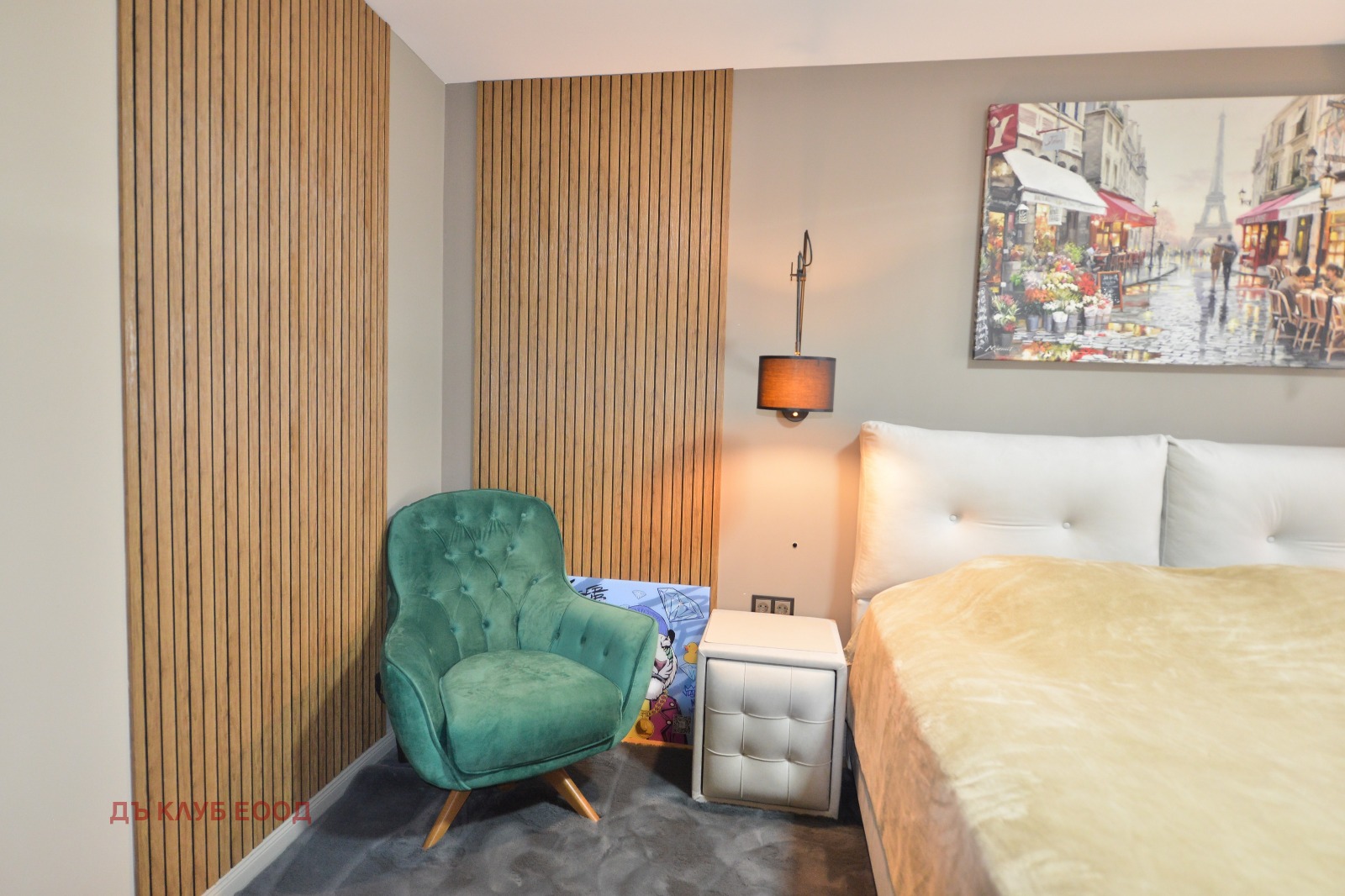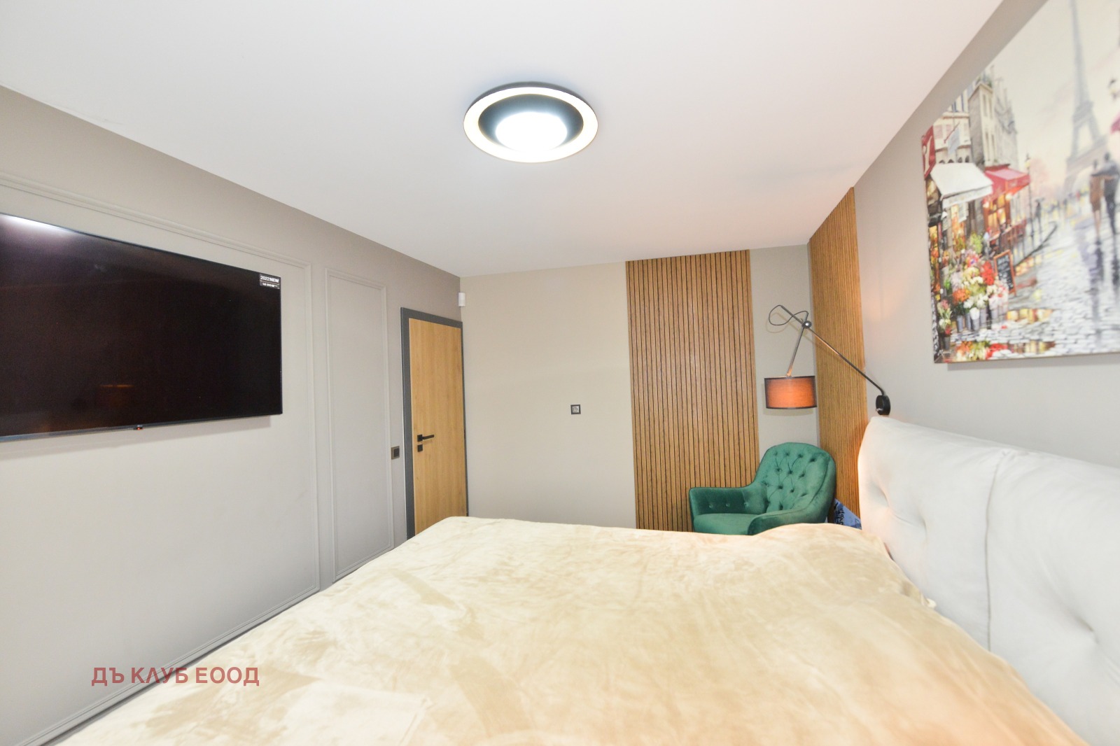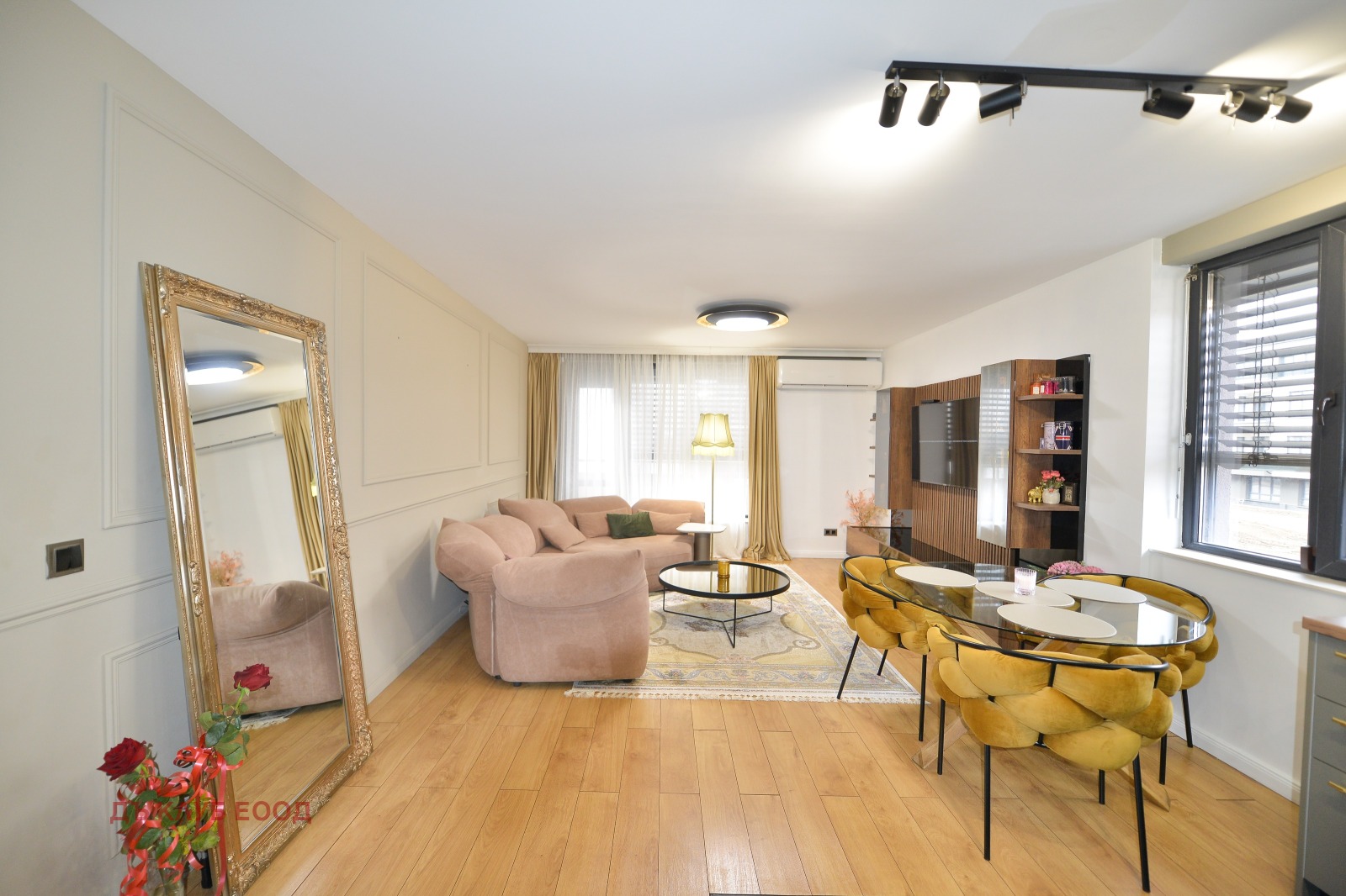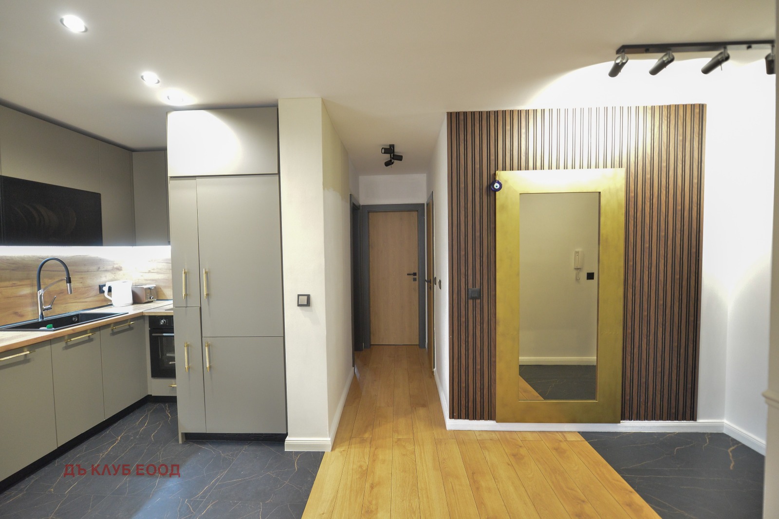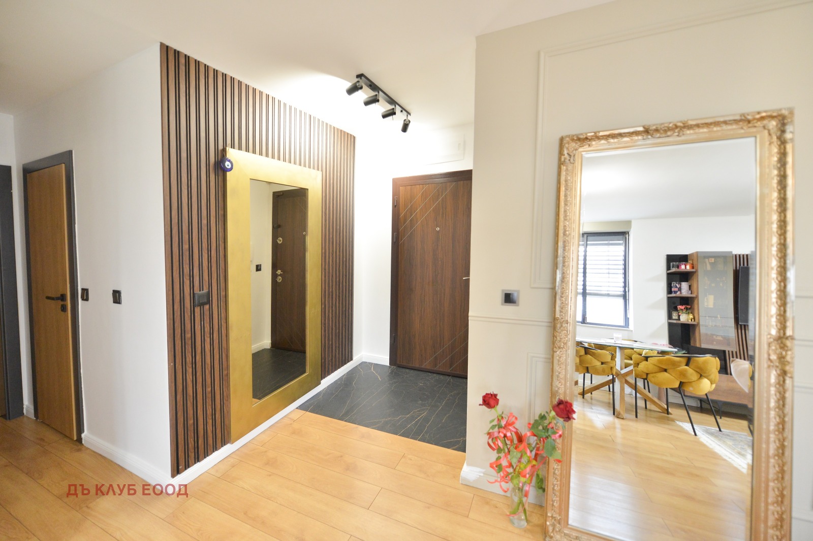 Разпределение: входно предверие / коридор, просторна дневна с кухненски бокс и трапезария, спалня, ОТДЕЛНА ГАРДЕРОБНА и ЛУКСОЗНА БАНЯ С ТОАЛЕТНА.