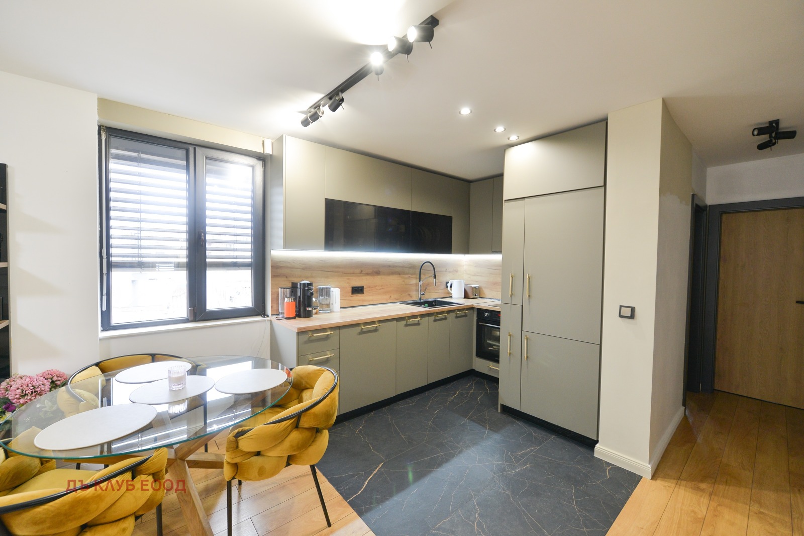 Апартаментът е НАПЪЛНО ОБЗАВЕДЕН И ОБОРУДВАН, реализиран с висококачествени материали, дизайнерско осветление, естествени дървесни акценти и кухня с вградени електроуреди от висок клас.