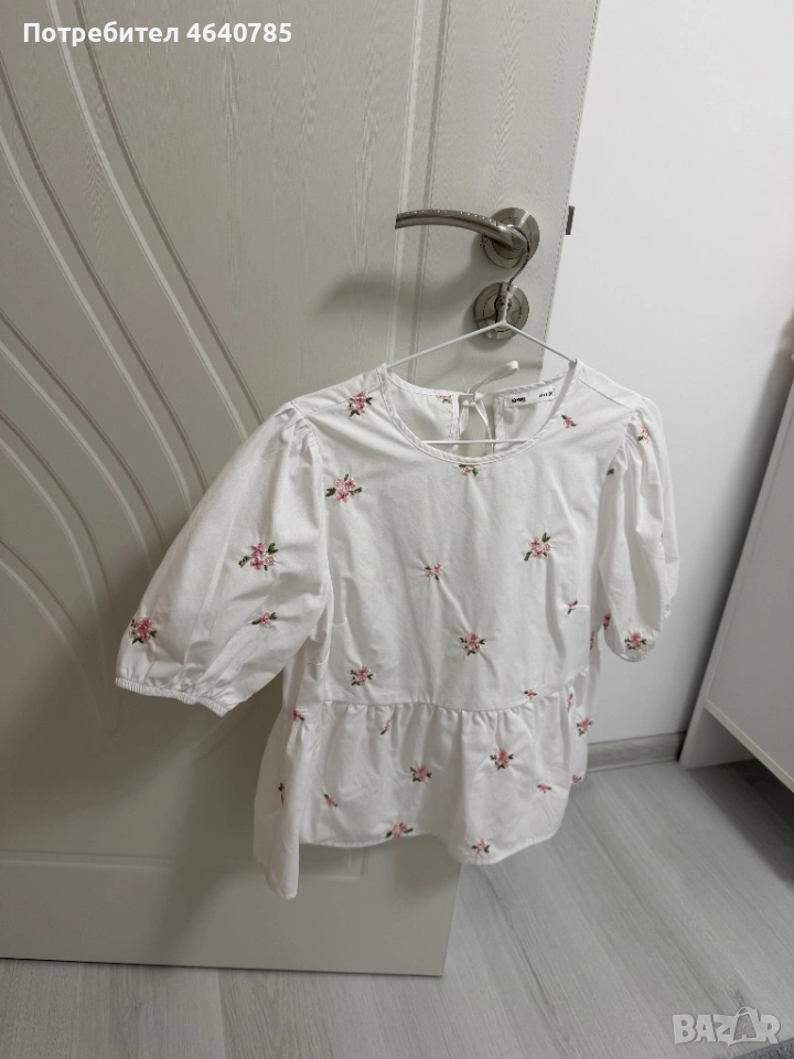 Стилна бяла блуза с нежна бродерия на малки розови цветя. Носена е само 1 път, в отлично състояние. Много лека и удобна, подходяща за пролет и лято.