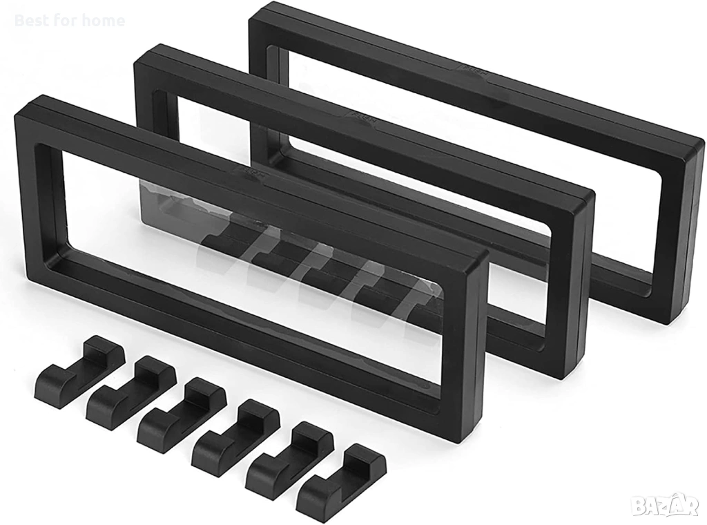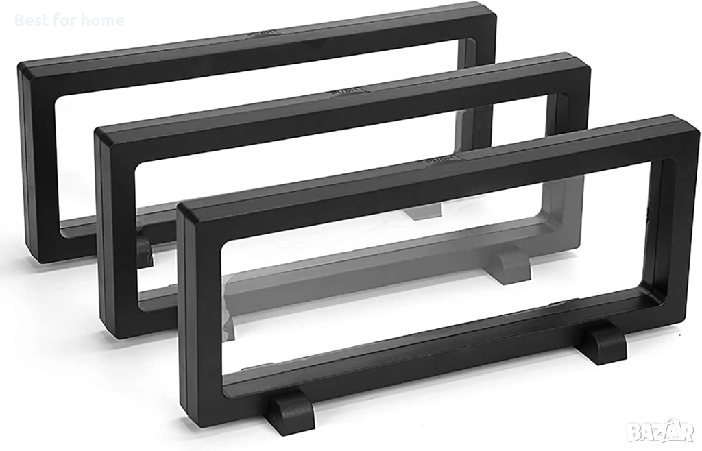 Комплект от 3 части: Всяка 3D плаваща пластмасова рамка с правоъгълен, прозрачен прозорец се поддържа от двете основи
