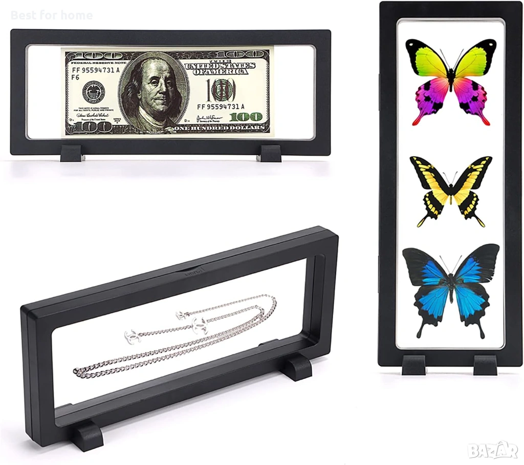 Уникална 3D плаваща рамка: Прозорецът на рамката кара вашите колекции да изглеждат сякаш плават между две гъвкави, прозрачни мембрани, придавайки на дисплея 3D ефект и създавайки зашеметяваща и привличаща вниманието визия.