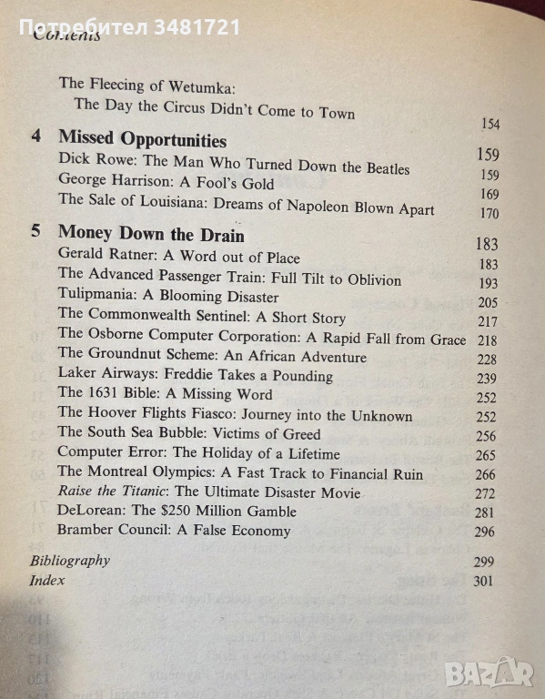 Някои от тези истории са забавни, други са ужасяващи и катастрофални, а трети са просто срамни. Измами, финансови решения без базова връзка с реалността, его, алчност или просто некадърност - всички те намират място в книгата. Разделена на няколко големи части (грешни концепции, банкови грешки, измами, пропуснати възможности и пари на вятъра), книгата разказва любопитни истории от цял свят. От Ирландският канал, който трябвало да свърже две езера, но така и не можело да бъде напълнен, тъй като стените му били направени от пореста повърхност, която пропускала водата към почвата. През личните дневници на Хитлер, които били продадени за 9.3 милиона марки, след което се оказало, че нямат много общо с Хитлер. До измамникът, който успял да продаде Айфеловата кула...според някои източници - два пъти, понеже първият купувач бил прекалено засрамен да признае грешката си в полицията.