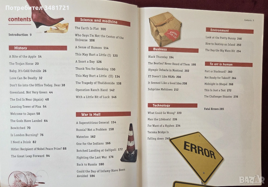 Книгата е разделена тематично на части за история, наука и медицина, война, бизнес, технологии, околна среда и човешкия фактор. В текст, много снимки и илюстрации, тя представя голям брой исторически несполуки, някои от тях просто забавни, а други трагични.