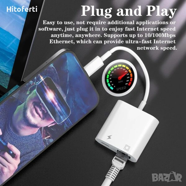 2 в 1 RJ45 Ethernet адаптер: Този мрежов порт за LAN кабел Lightning към RJ45 Ethernet + порт за зареждане поддържа достъп до интернет и зареждане едновременно. Можете да свържете мрежовия кабел към вашия iPhone/iPad, за да получите достъп до кабелната мрежа, осигурявайки ултрависокоскоростен достъп до интернет, което ви позволява да гледате видеоклипове, да играете игри или да осъществявате поточно предаване на живо по-плавно и да получите по-плавно интернет изживяване.
