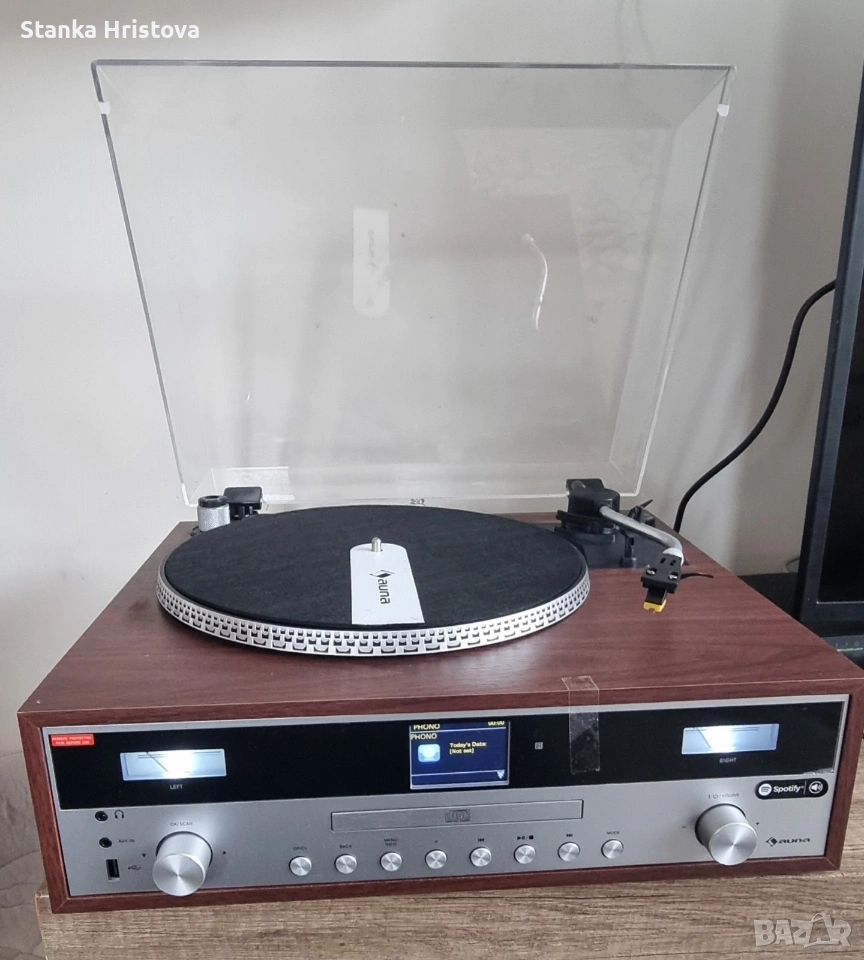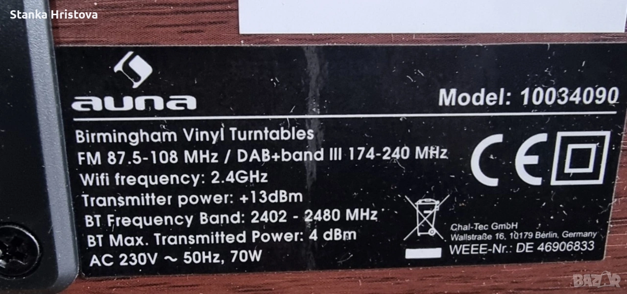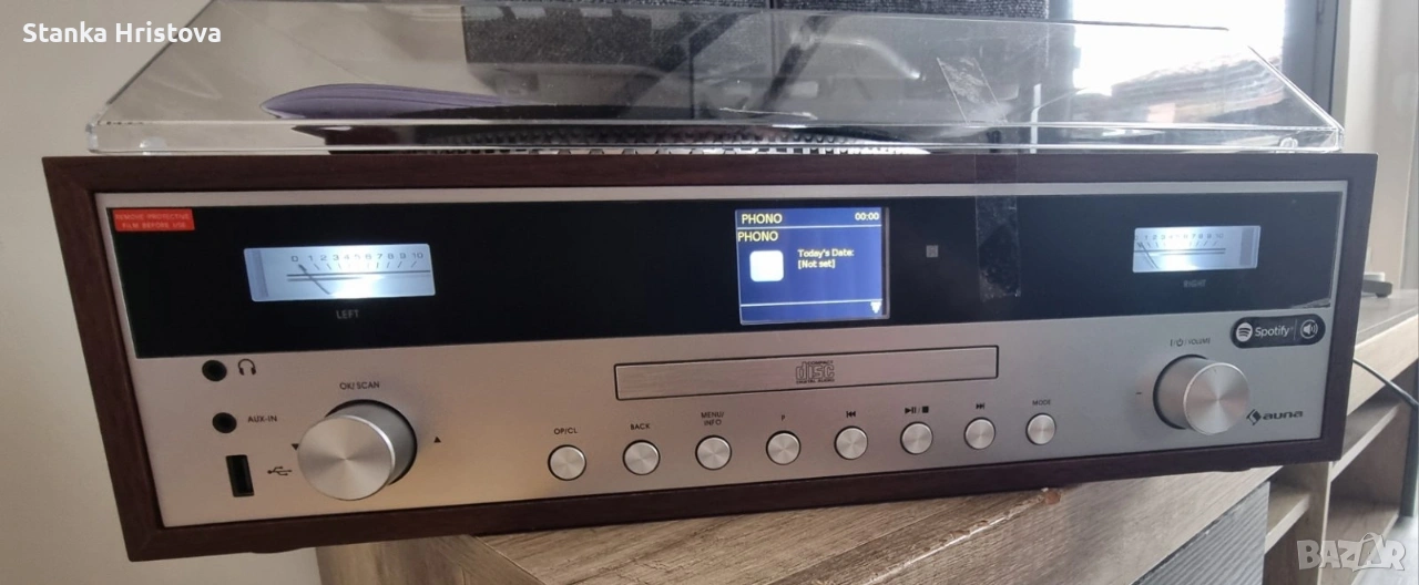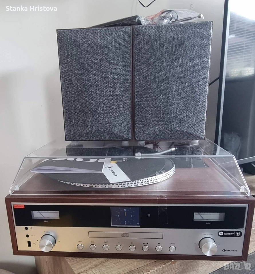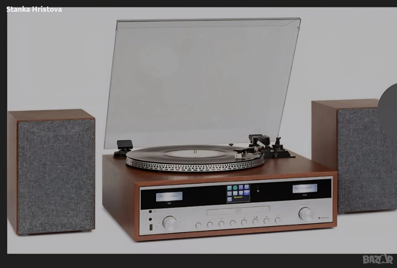 Силен звук, гъвкавост, много връзки: auna BirminghamHiFi стерео система обединява всички важни функции за възпроизвеждане на музика в едно устройство. В основата на aunaBirmingham HiFi стерео система стои грамофон, задействан с ремък, с две скорости от 33 и 45 оборота в минута под защитния капак. Заедно с MP3 плейър, съвместим с MP3, той оформя центъра на устройството. Интернет радио тунер, DAB + и FM радио тунер получават локални сигнали, както и много цифрови канали от цял свят с високо качество на звука и без прекъсване на шума. Благодарение на функцията Bluetooth, всички аудио файлове от вашия смартфон, таблет или лаптоп могат да се възпроизвеждат безжично и удобно чрез стерео системата . USB портът отпред позволява безпроблемно възпроизвеждане на много MP3 файлове, както и запис на музикални заглавия от грамофони и CD плейъри. aunaBirmingham , оборудвана с 2 отделни високоговорителя 50 W макс. (2 x 12,5 W RMS), се е доказало като спестяващо място цялостно HiFi решение, което се предлага и в жилищни помещения с ограничено пространство. AUX входът и връзката за слушалки разширяват ретро стерео системата с други полезни компоненти. Внос от Германия.