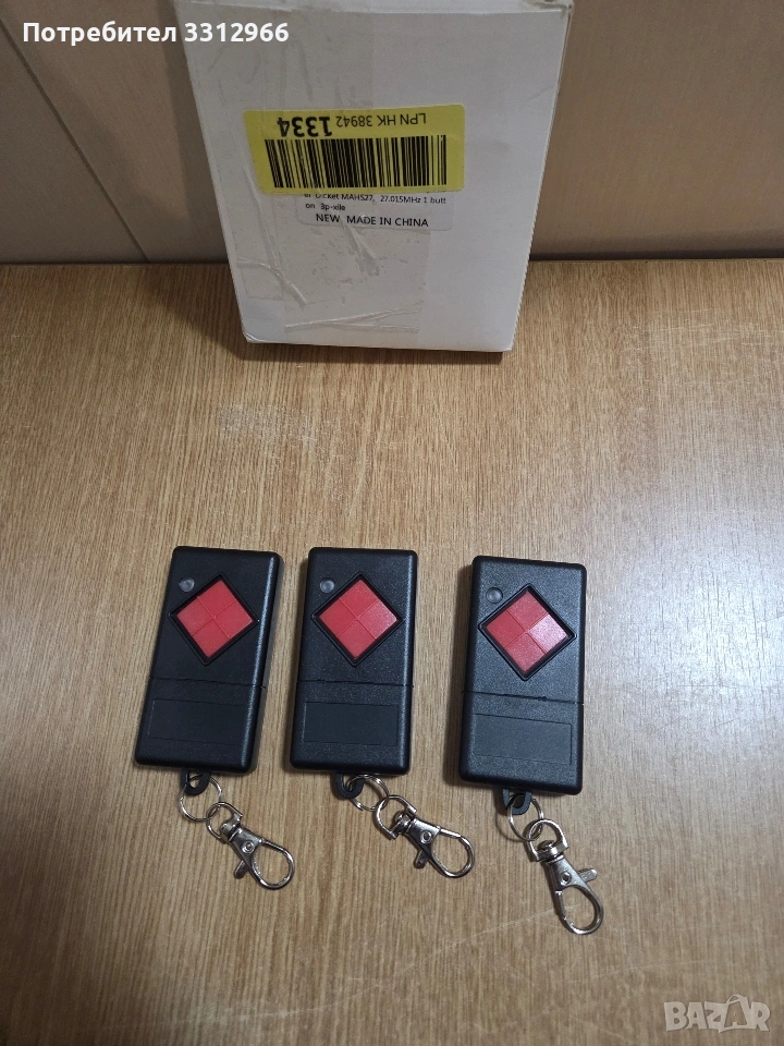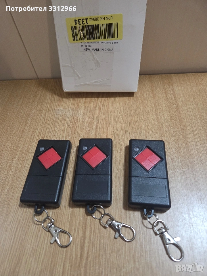 3 броя дистанционни управления за портали и гаражни врати от марката Dickert, модел MAHS27-01. Честота: Работят на 27.015 MHz. Канали: 1-канален предавател. Кодиране: Използват фиксиран код, който се настройва чрез 10-позиционен DIP превключвател вътре в дистанционното. Захранване: Работят с 12V батерия тип 23A.