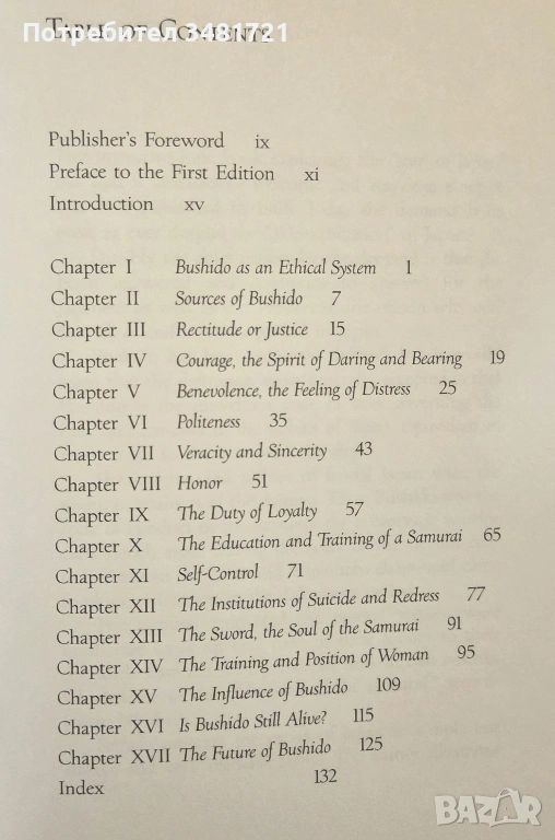 Публикувана за първи път през 1905та година под името „Бушидо: Душата на Япония“, книгата разкрива същността на самурайските воини и японската култура и представлява едно от най-популярните и автентични изображения на японската самурайска философия. Бушидо е изиграло важна роля във формирането на съвременното японско общество, както и на различните съвременни японски бойни изкуства в Япония и в международен план. Авторът разглежда неговата история, философия, основни постулати, изследвайки не просто 7те основни мотива от кодекса на самурая, но как тези ценности се различават от западните си аналози.