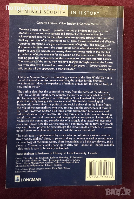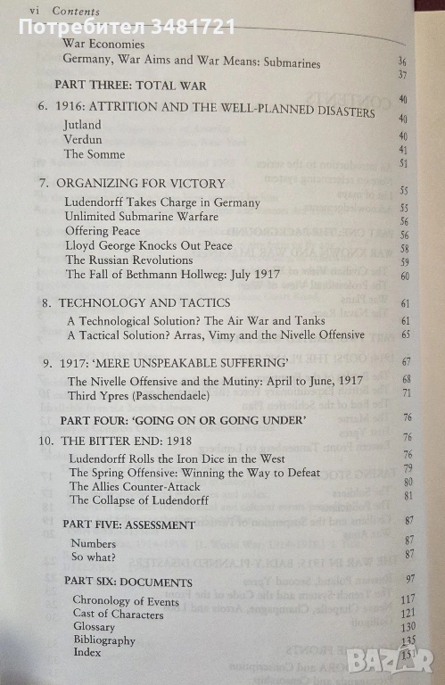 Книгата представя историята на войната, като включва не само предисторията и причините за нея, заедно със самите военни събития, но също политическите и социалните промени в различните държави, връзката между войната и индустриализацията, икономическите и демографските ефекти, както и исторически документи - от песни на британски войници до оценката на немски такива за окопната война. Включени, също така, са хронологична справка на всички събития, заедно с имената на всички основни действащи лица през войната.