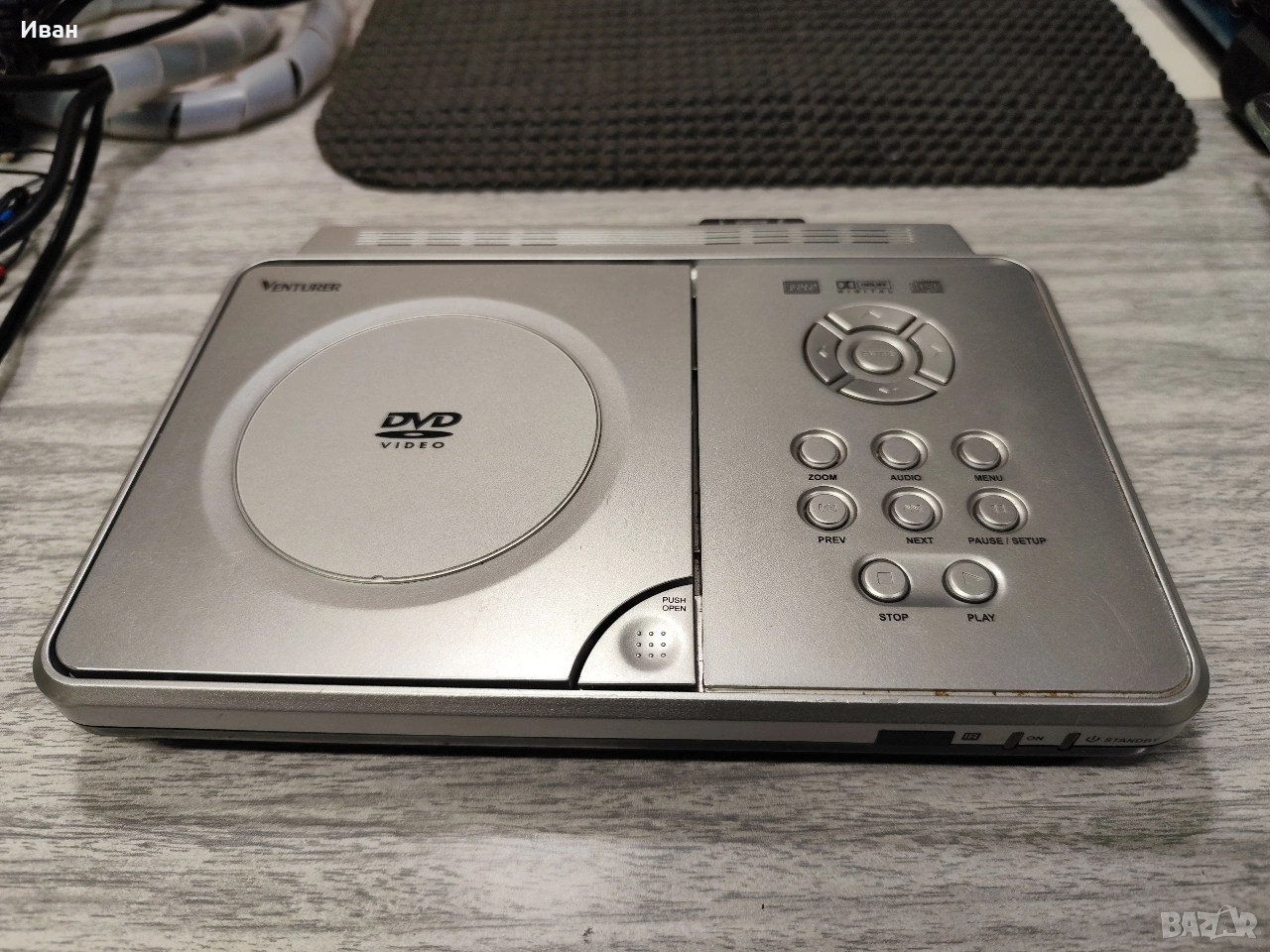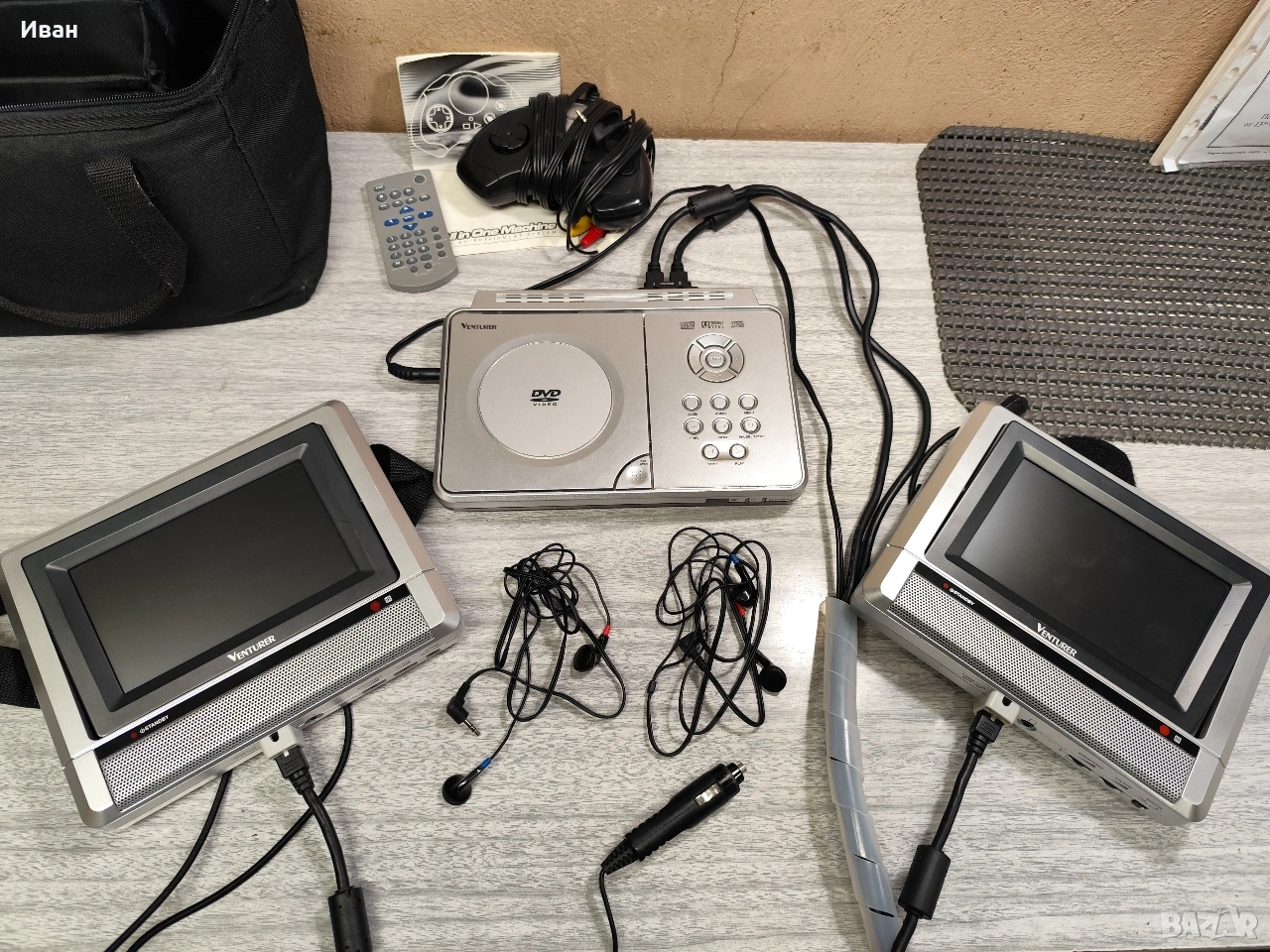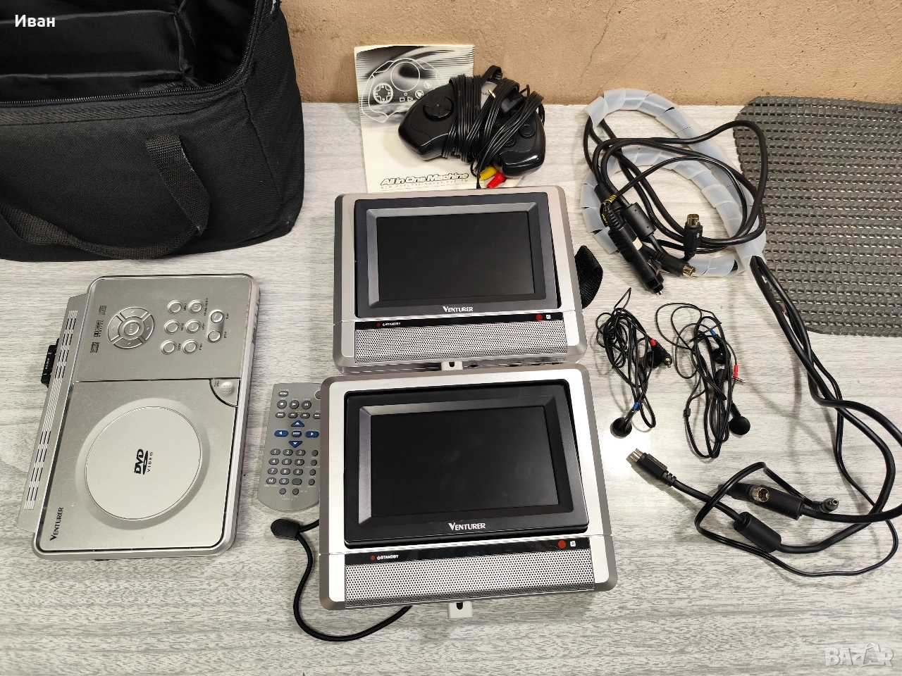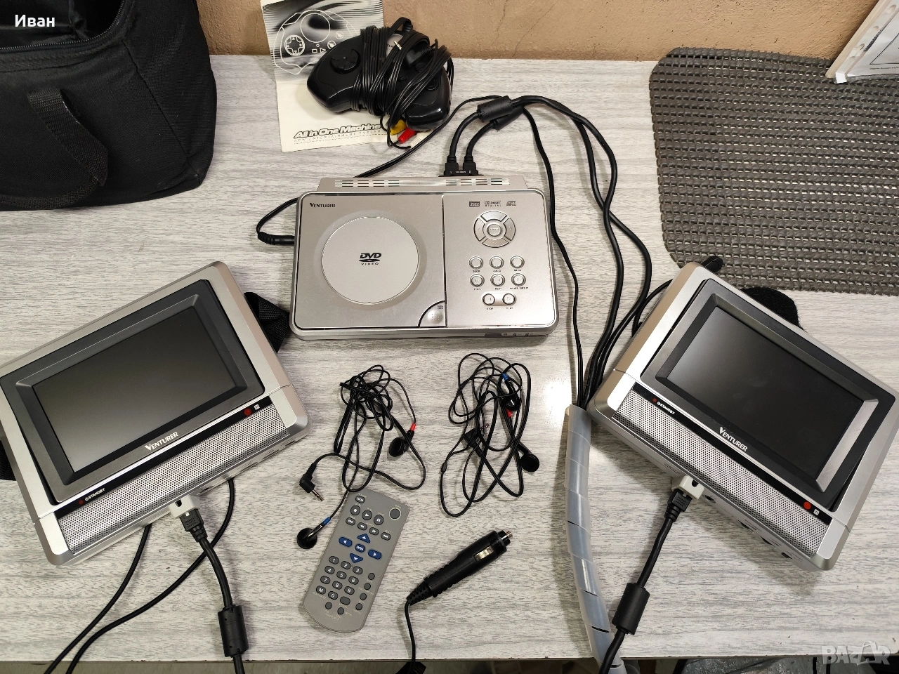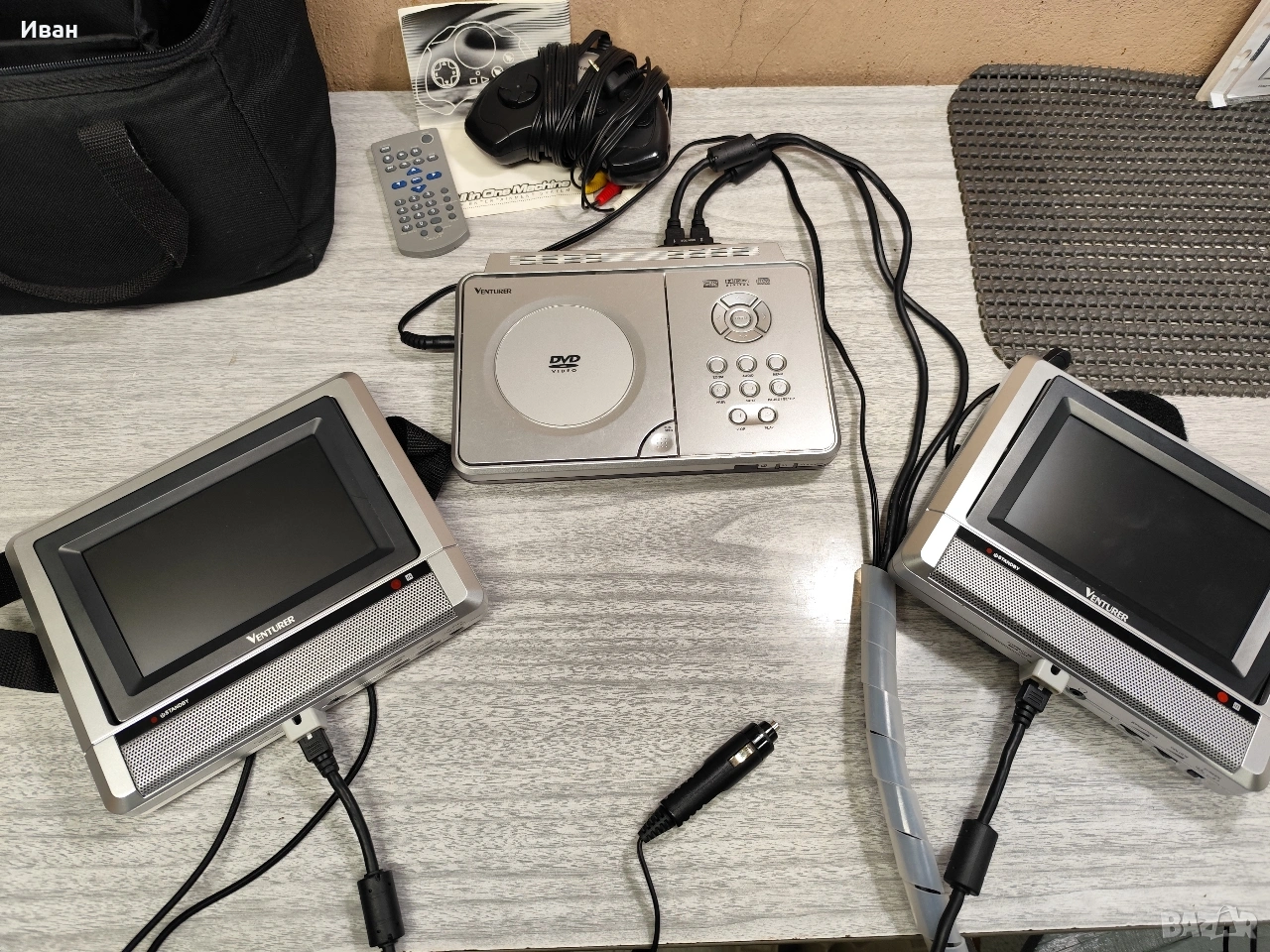 Преносим DVD плейър, марка Venturer PVS 1961, 7" инча екран, 2 монитора с 1 кабели, слушалки, дистанционно, джойстик и чанта. Мониторите могат да се захванат за възглавничките на предните седалки в автомобил. Подходящо е за ползване в автомобил за забавление на деца при дълъг път. Работи отлично. Ползвано е два пъти.
