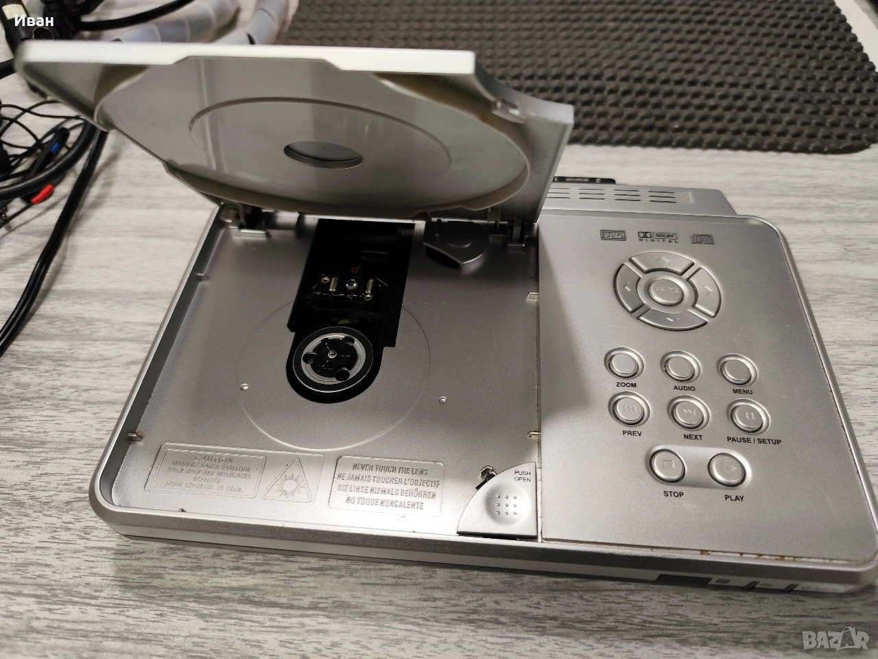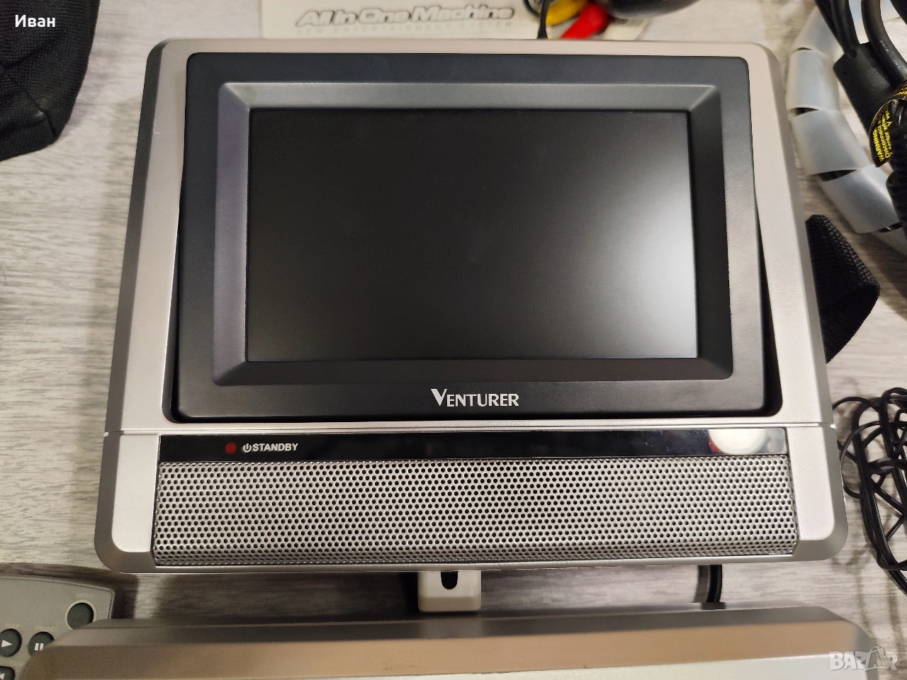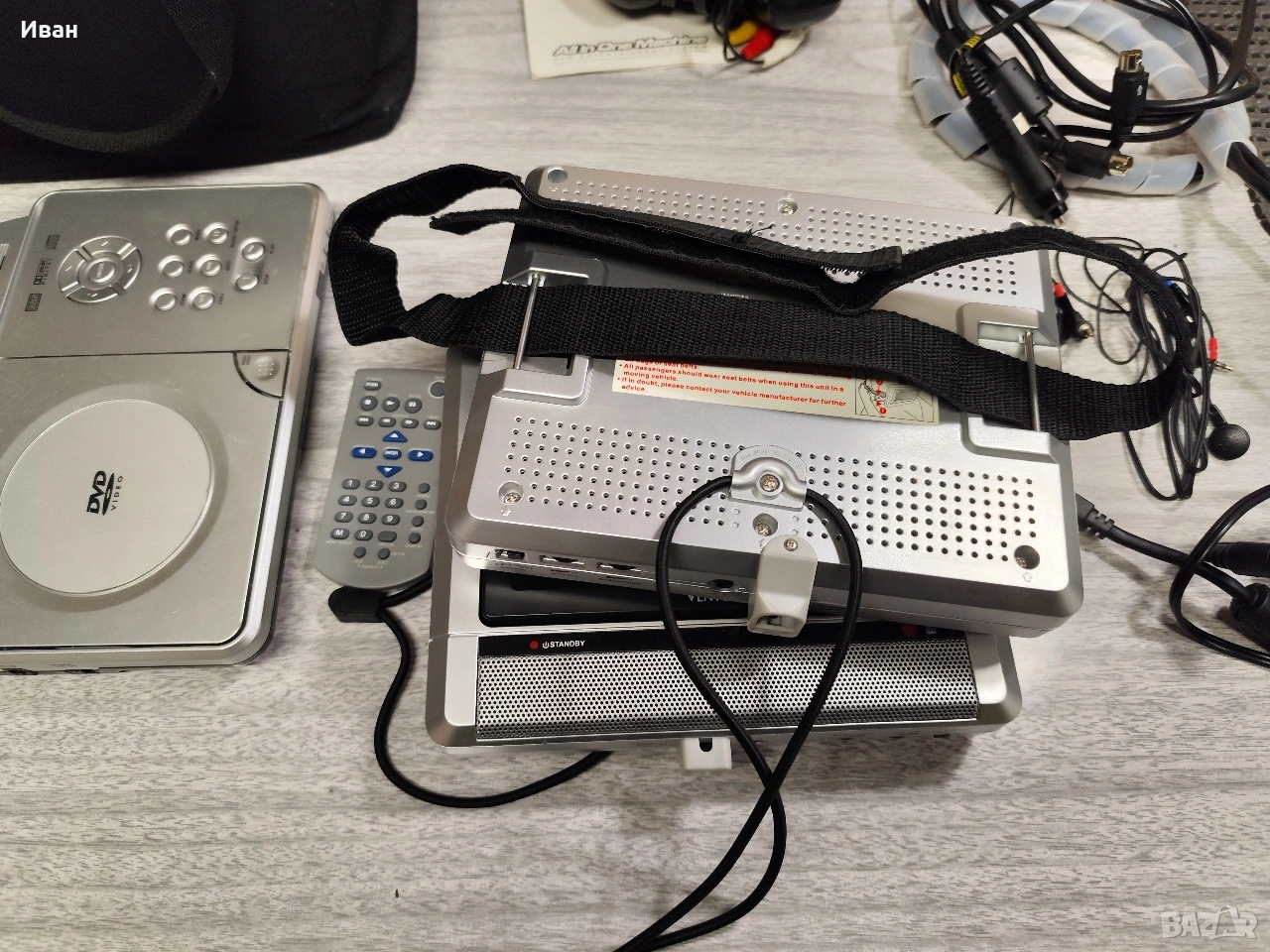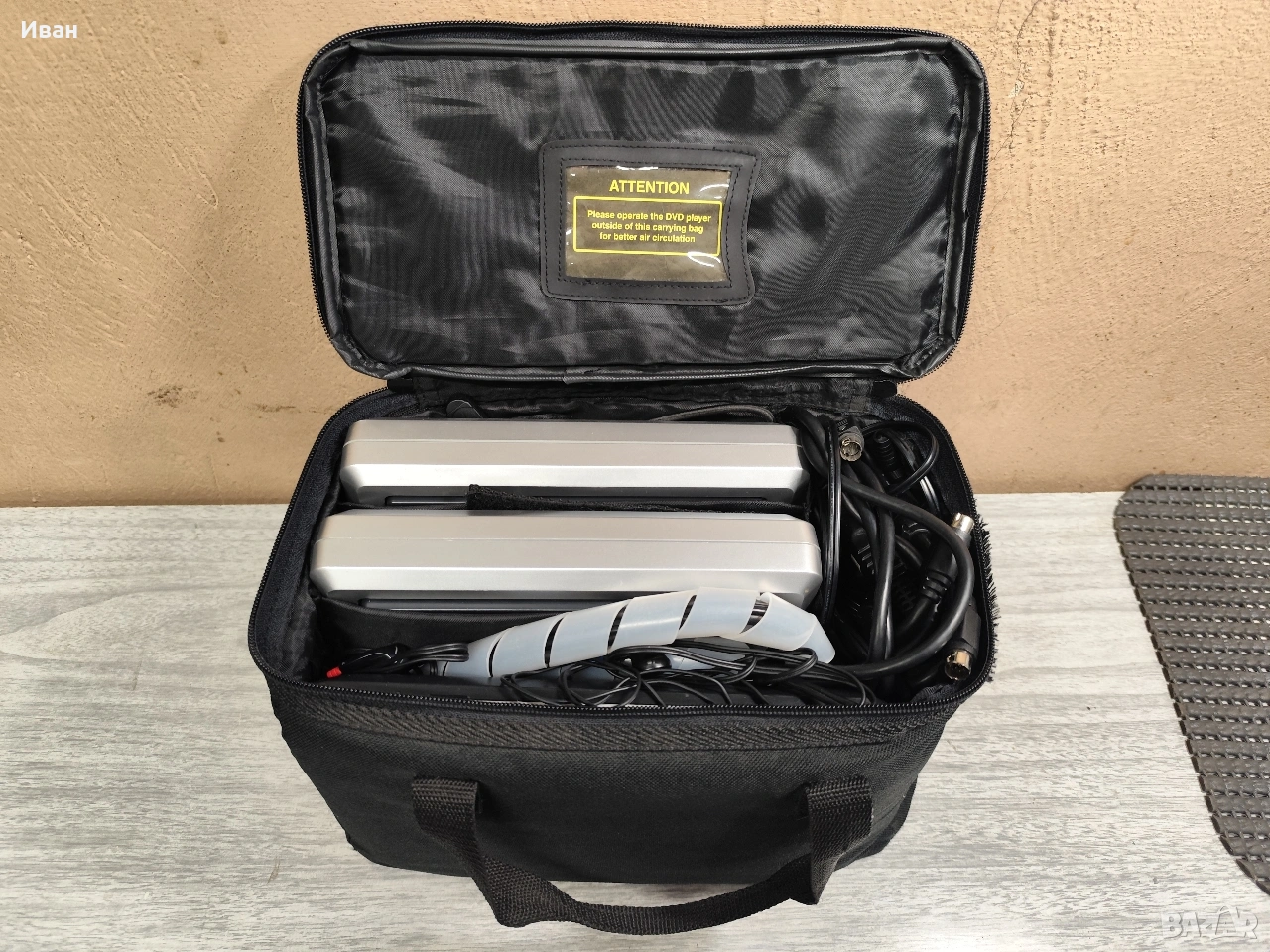 Преносим DVD плейър, марка Venturer PVS 1961, 7" инча екран, 2 монитора с 1 кабели, слушалки, дистанционно, джойстик и чанта. Мониторите могат да се захванат за възглавничките на предните седалки в автомобил. Подходящо е за ползване в автомобил за забавление на деца при дълъг път. Работи отлично. Ползвано е два пъти.