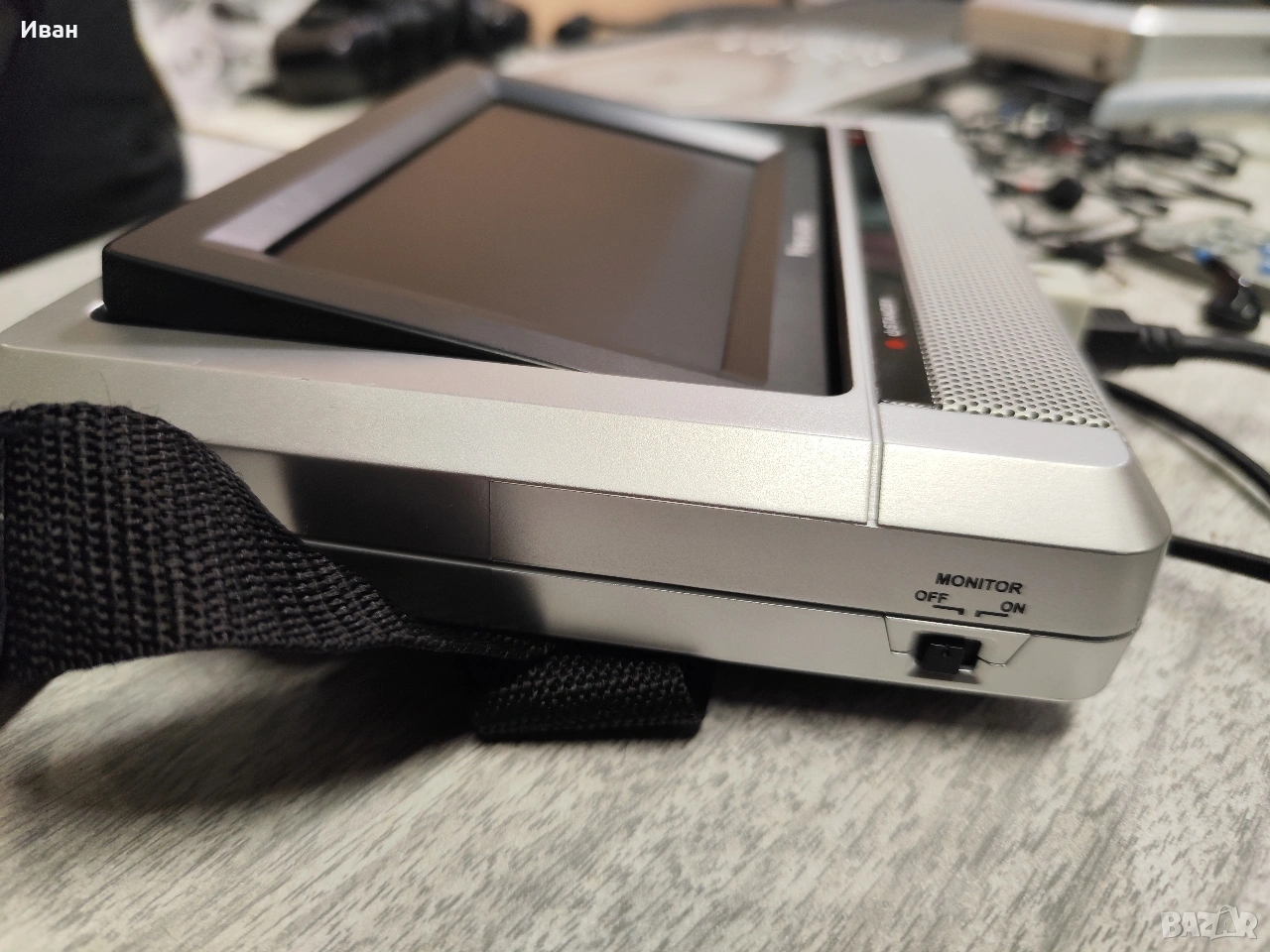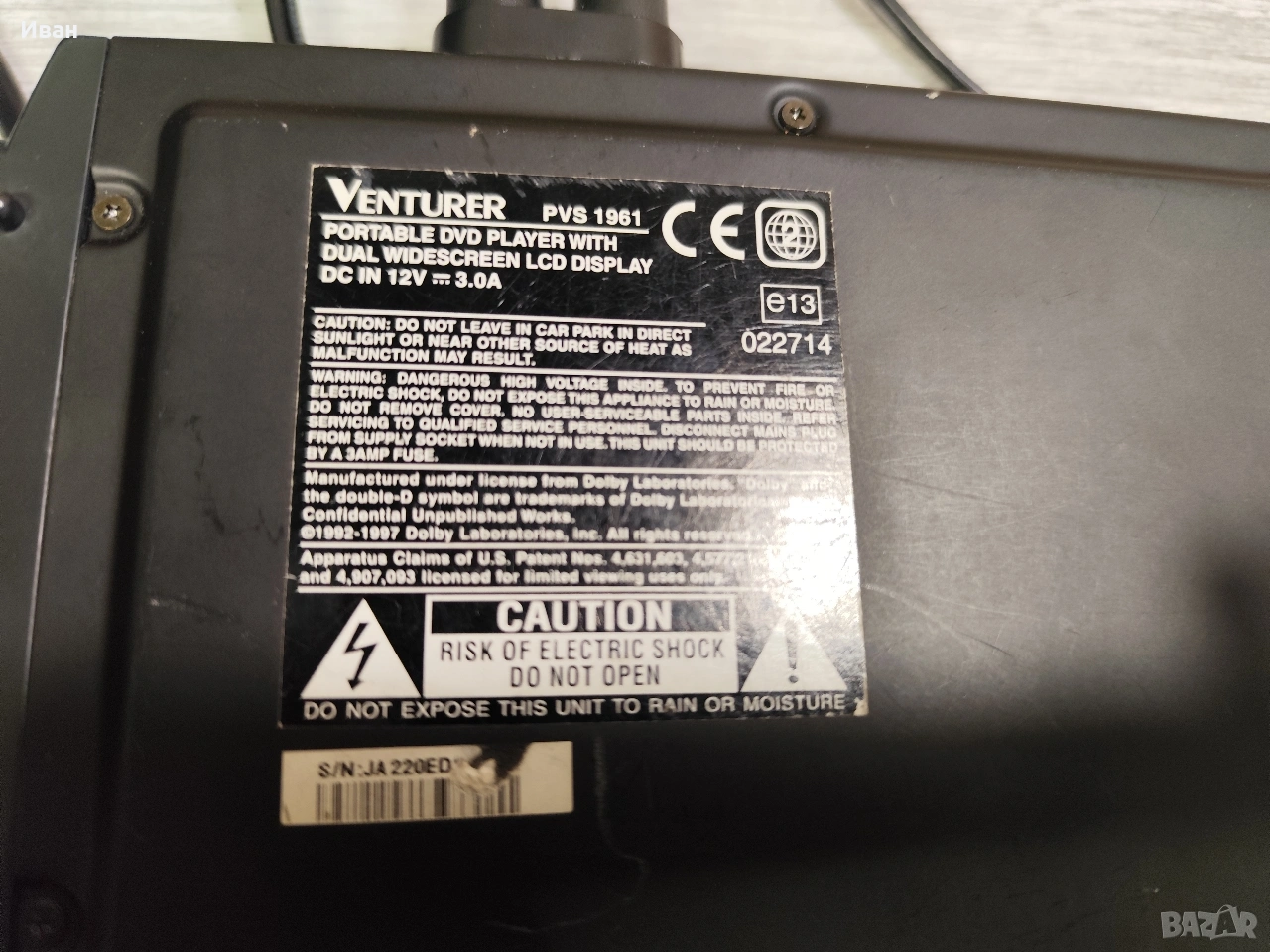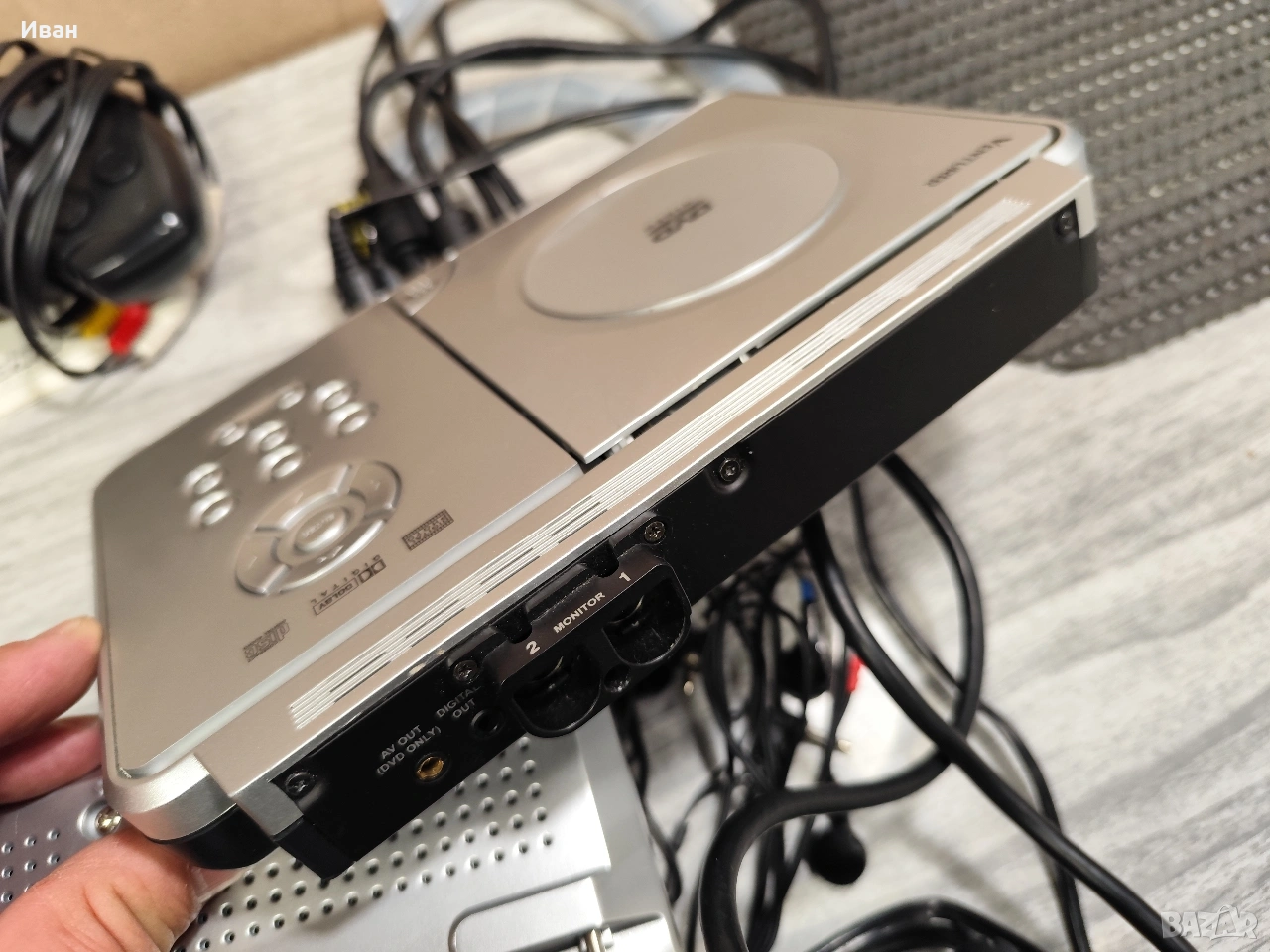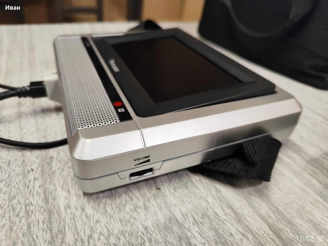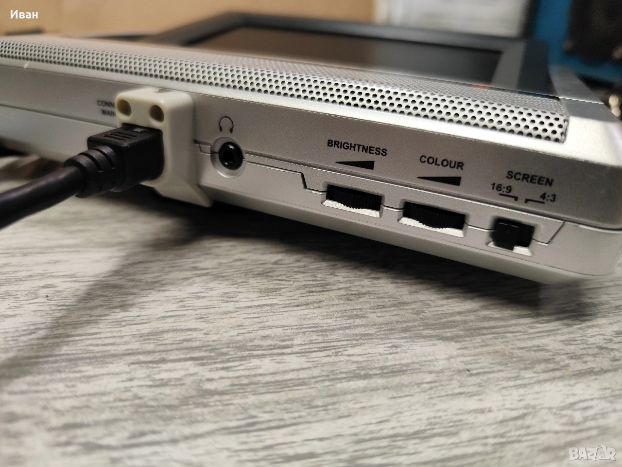 Преносим DVD плейър, марка Venturer PVS 1961, 7" инча екран, 2 монитора с 1 кабели, слушалки, дистанционно, джойстик и чанта. Мониторите могат да се захванат за възглавничките на предните седалки в автомобил. Подходящо е за ползване в автомобил за забавление на деца при дълъг път. Работи отлично. Ползвано е два пъти.
