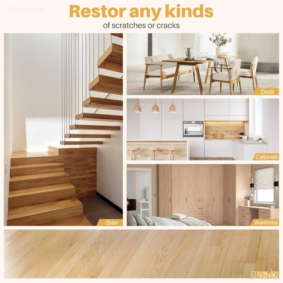 Професионален комплект за възстановяване на дървени повърхности NYBQ, предназначен за прецизна поправка на повърхностни и дълбоки драскотини, пукнатини, дупки и структурни дефекти. Формулата на полимерния пълнител е съвместима с широка гама материали, включително масивна дървесина, паркет, ламинат, винил и фурнир. Продуктът предлага ефективно решение за реставрация на мебелни компоненти като врати, столове, маси, шкафове, стълби и работни плотове, осигурявайки трайно запечатване и възстановяване на първоначалния визуален вид на детайла.