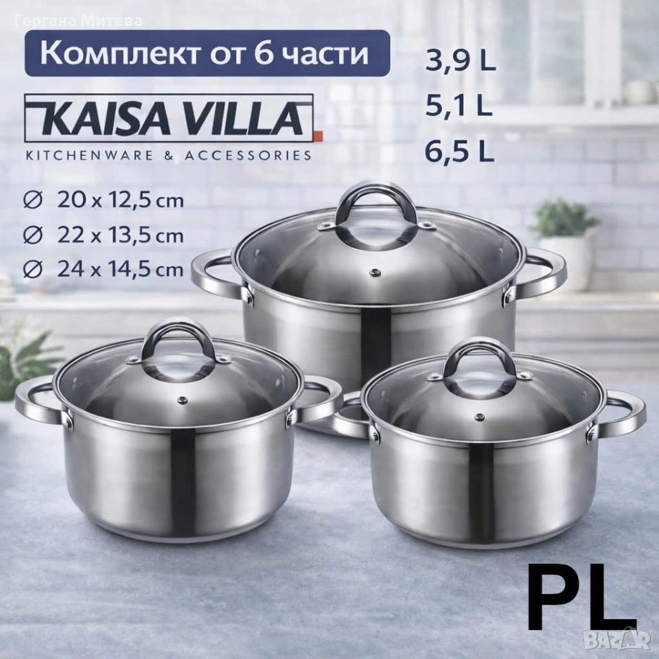 Комплект от 3 тенджери KAISA VILLA от неръждаема стомана – 6 части, с капаци, за всички котлони Описание: Комплектът KAISA VILLA включва 3 броя тенджери с капаци, изработени от висококачествена неръждаема стомана (Inox), подходящи за ежедневна и интензивна употреба. Съдовете осигуряват равномерно разпределение на топлината и отлични резултати при готвене. Тенджерите са с различни размери и вместимост, което ги прави практични за приготвяне на супи, основни ястия, сосове и семейни порции. Комплектът е съвместим с всички видове котлони, включително индукционни. Размери и вместимост: Тенджера Ø 20 × 12,5 cm – 3,9 L Тенджера Ø 22 × 13,5 cm – 5,1 L Тенджера Ø 24 × 14,5 cm – 6,5 L Характеристики: Комплект: 3 тенджери + 3 капака (общо 6 части) Материал: Неръждаема стомана (Inox) Капаци: Стъклени, с метален кант и отвор за пара Подходящи за: газови, електрически, стъклокерамични и индукционни котлони Поддръжка: Лесно почистване, подходящи за съдомиялна машина Комплектът KAISA VILLA е отличен избор за всяка модерна кухня, съчетавайки функционалност, изчистен дизайн и дълготрайна употреба. Състояние:Ново Доставка до 3-4 дни с преглед и тест