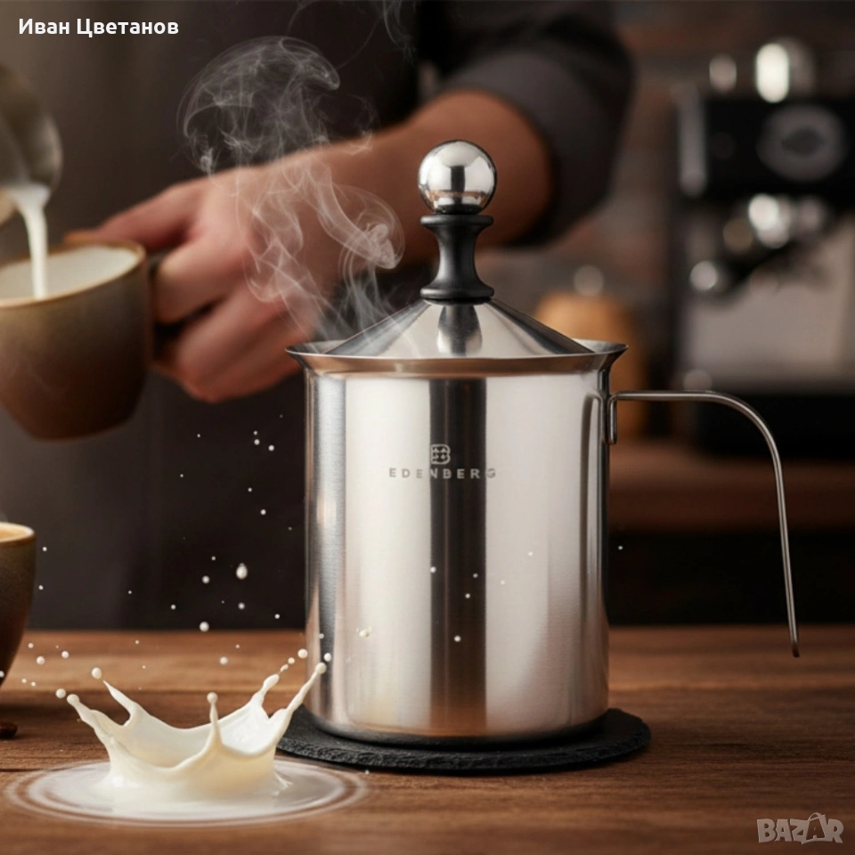 Ръчен уред за разпенване на мляко Edenberg, неръждаема стомана, мерителна скала, 400мл / 800мл → Обява 53750381