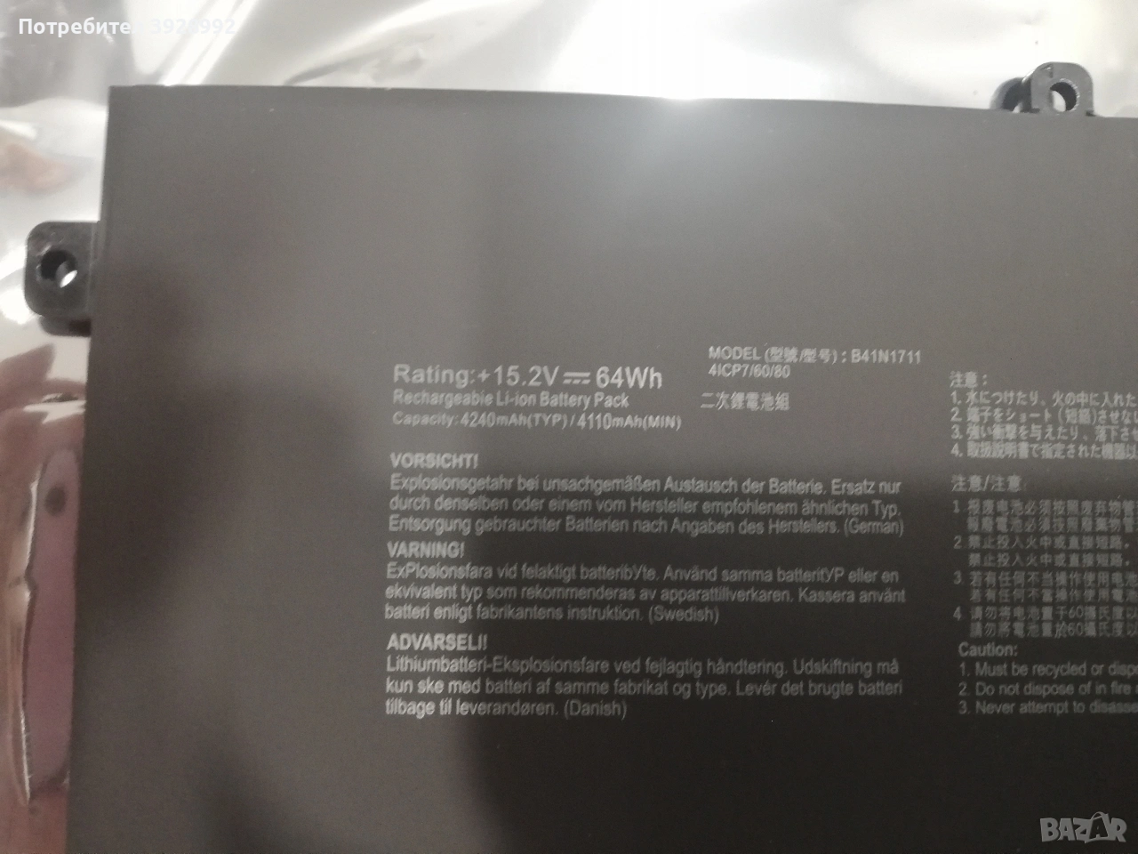 Чисто нова батерия за лаптоп ASUS / Battery type: Li-Ion Волтаж / Voltage: 15.2V Капацитет / Capacity: 63Wh -64Wh Батерията е съвместима за следните парт номера (Part Number Compatibility): ASUS 0B200-02730100 B41N1711 Съвместимост на следните модели лаптопи ASUS FX503VD FX503VM FX63V FX63VD FX63VD7300 FX63VD7700 fx63vm FX63VM7300 FX705 FX705D FX705DD FX705DY FX73VD FX73VM GL503GE GL503VD GL503VD-1A GL503VD-1B GL503VD-1D GL503VM GL503VM-1A GL503VM-1B GL503VM-1C GL503VM-1D GL503VM-1E GL503VM-FY022T GL503VM-FY100T GL503VM-GZ081 GL503VM-GZ083T GL503VM-GZ084T GL503VM-GZ211T GL703 GL703GE GL703GE-ES73 GL703GEE GL703VD GL703VD-1A GL703VD-1B GL703VD-DB74 GL703VD-GC008T GL703VD-GC024T GL703VM GL703VM-1A GL703VM-1B GL703VM-GC111T PX703GE PX705GD PX705GM ROG GL503GE ROG GL503VD ROG GL503VD-DB74 ROG GL503VD-FY005 ROG GL503VD-FY007T ROG GL503VD-FY009T ROG GL503VD-FY077T ROG GL503VD-FY111T ROG GL503VD-FY126T ROG Station 17 PX703GE-GC153R ROG Station 17 PX705GD-EW098R ROG Station 17 PX705GM-EW074R ROG STRIX GL503 ROG STRIX GL503GE ROG Strix GL503VD ROG Strix GL503VM ROG STRIX GL703 ROG STRIX GL703GE ROG Strix GL703VD ROG Strix GL703VM TUF FX705 TUF FX705 GM TUF FX705DD TUF FX705DT TUF FX705DU TUF FX705DY TUF FX705GD TUF FX705GE TUF FX705GM TUF Gaming FX705 TUF Gaming FX705DD TUF Gaming FX705DT TUF Gaming FX705DU TUF Gaming FX705DY TUF GAMING FX705GD TUF Gaming FX765GM TUF GAMING PX705GD TUF GAMING PX705GM TUF705DT TUF705DY TUF705GD TUF705GE TUF705GM TUF765DT TUF765GD TUF765GE TUF765GM ZX63 ZX63V ZX63VD ZX63VM ZX73VD ZX73VM