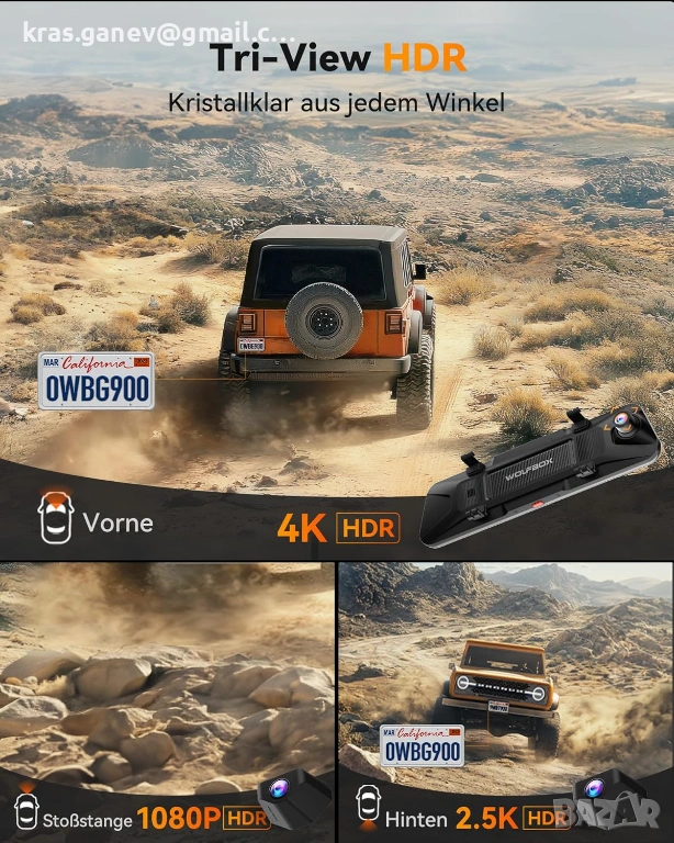 Камера за приключения на открито: Революционната камера за броня от WOLFBOX - разработена за изследователи и авантюристи. Тази иновативна огледална видеорегистратор записва видео от уникална перспектива на предната броня. Водоустойчивата им конструкция осигурява издръжливост при всякакви метеорологични условия и ги прави идеални за употреба в неравен терен. С тази новаторска перспектива за запис, тя предлага несравнимо наблюдение на терена за нуждите на ентусиастите на офроуд.