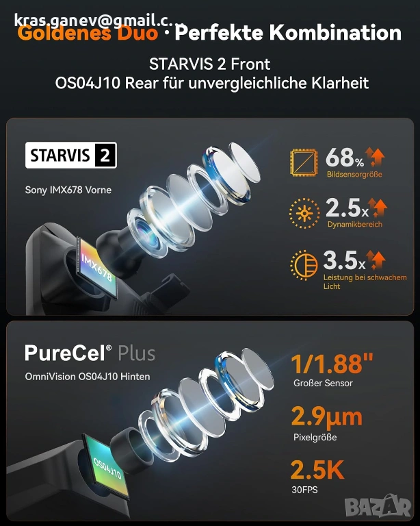 STARVIS 2 4K видеорегистратор за задно виждане: предната камера WOLFBOX G900 Tripro със сензор STARVIS 2 IMX678 записва зашеметяваща 4K резолюция 3840 x 2160 при 30 FPS. Благодарение на по-голямата светлочувствителна повърхност на STARVIS 2, тя впечатлява особено при трудни условия на осветление и предлага подобрен динамичен диапазон. Тази технология осигурява по-ясни и по-живи снимки с подобрен контраст и детайлно показване - дори при взискателни условия на осветление.