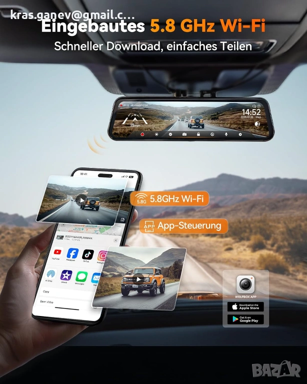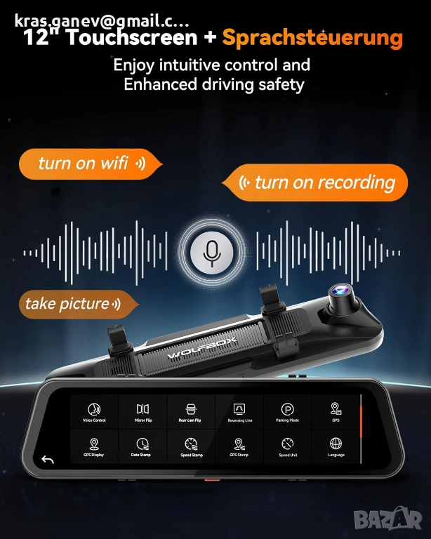 Безпроблемен 5.8 GHz WiFi и гласово управление: огледалната видеокамера с 5.8 GHz WiFi позволява по-бързи и по-надеждни връзки към вашия смартфон. Лесно достъпвайте видеоклипове, проверявайте записи и споделяйте клипове чрез приложението WOLFBOX. Гласовото управление позволява да се управляват прости функции на 3-каналната огледална камера, така че винаги да можете да шофирате концентрирано.