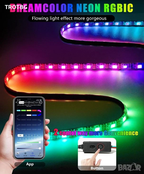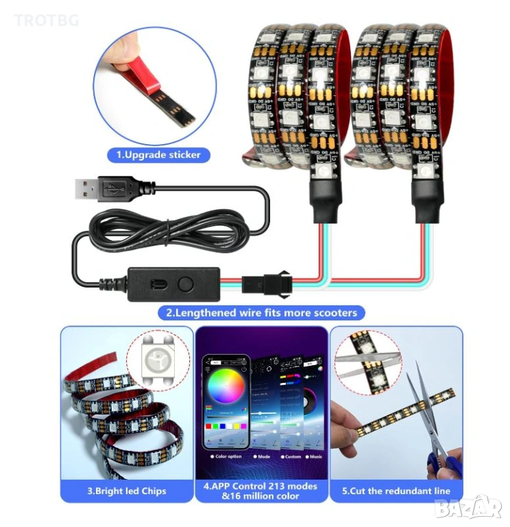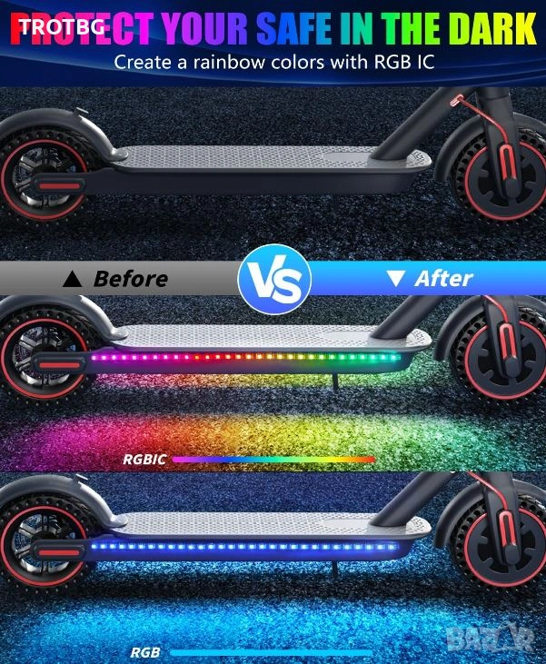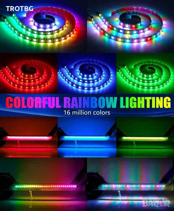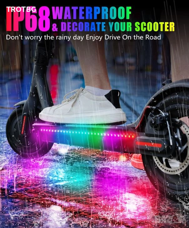 Многоцветни водоустойчиви LED светлини за електрически тротинетки и скутери, които могат да се оразмеряват спрямо необходимата дължина.