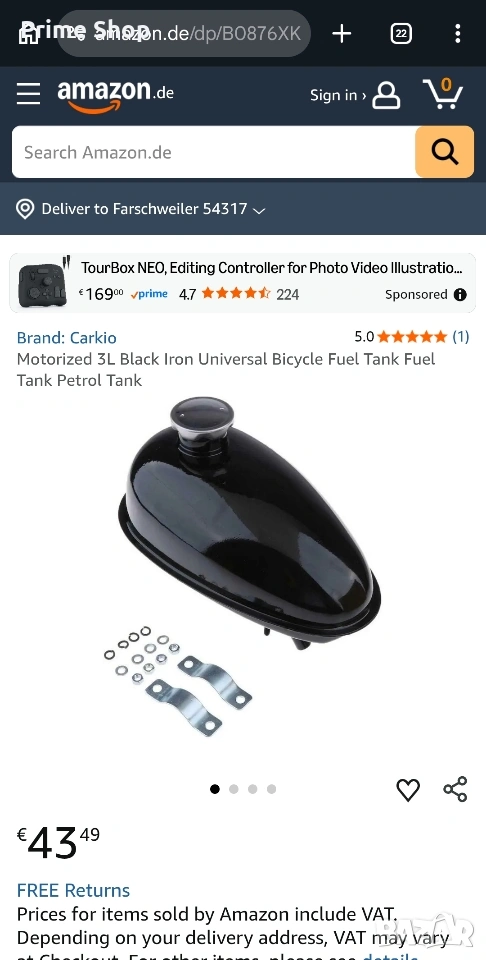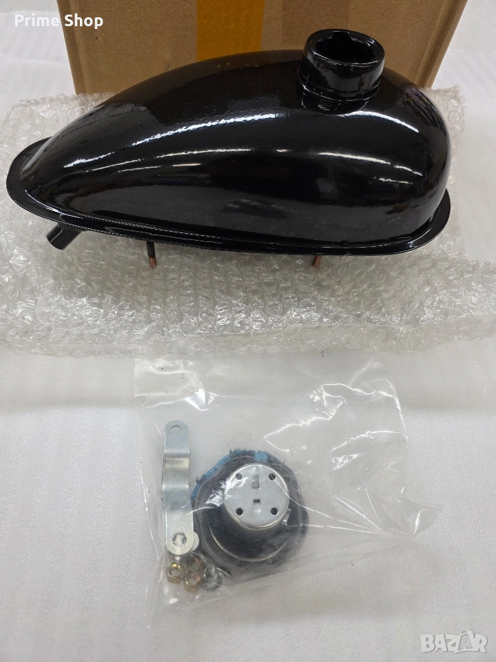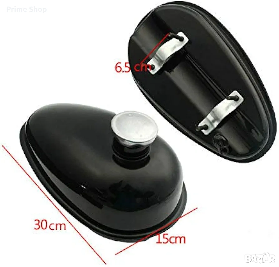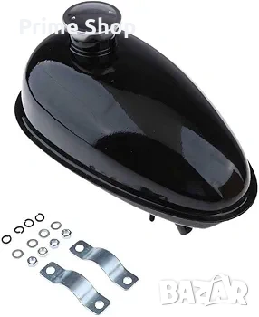 Представеният продукт е метален резервоар за гориво с марка Carkio, специално проектиран за монтиране на мотовелосипеди. Изработен е от здрава желязна сплав с черно външно покритие, което осигурява устойчивост на корозия и дълготрайност при експлоатация. С капацитет от 3 литра, този резервоар е съвместим с двигатели с работен обем от 49cc, 60cc, 66cc и 80cc. Конструкцията разполага с фабрично заварени монтажни шпилки в долната част, което позволява директен и стабилен монтаж върху рамката на велосипеда чрез предоставените в комплекта крепежни елементи.