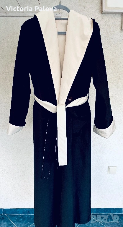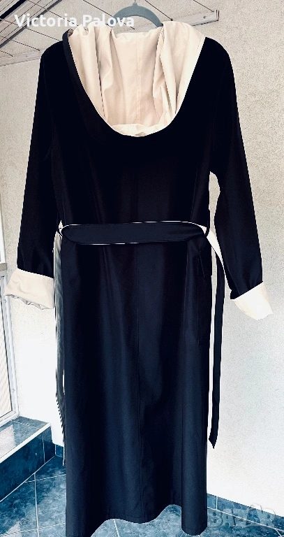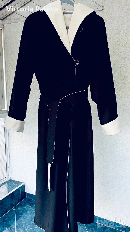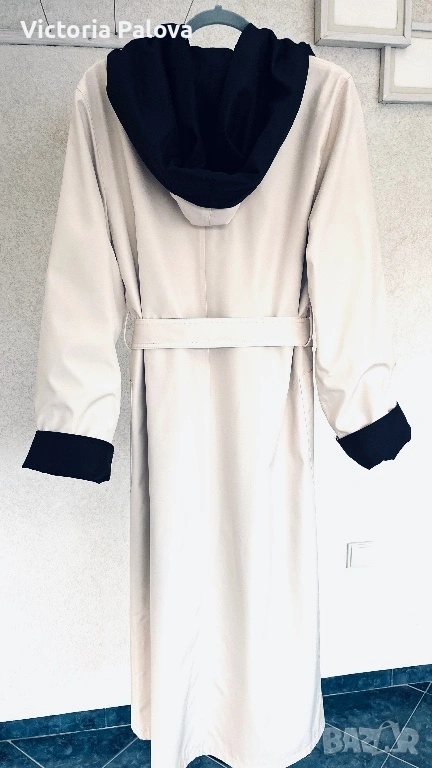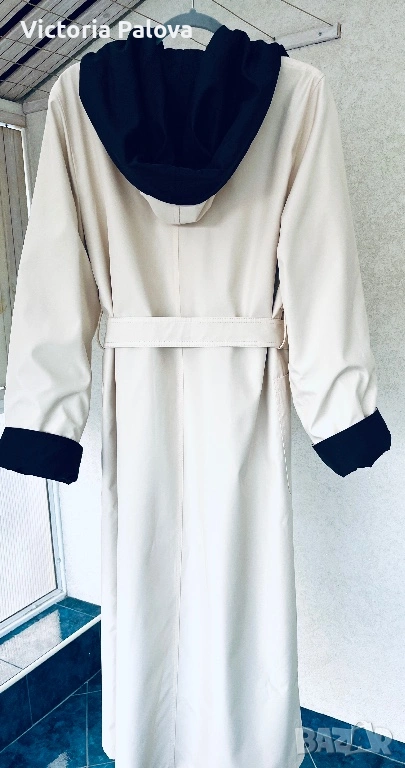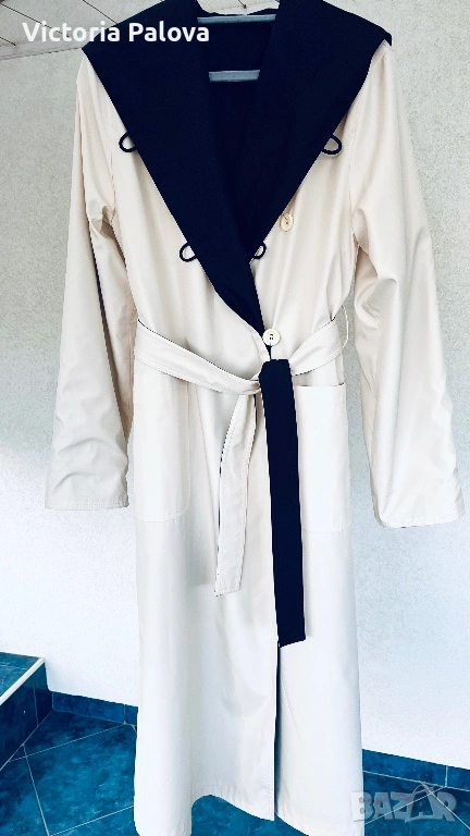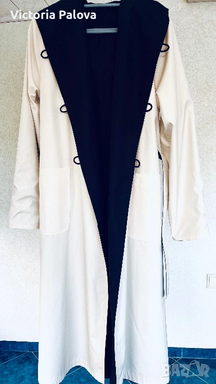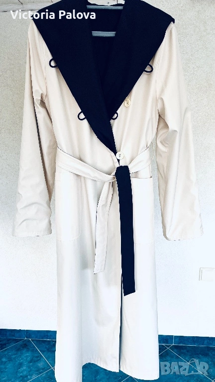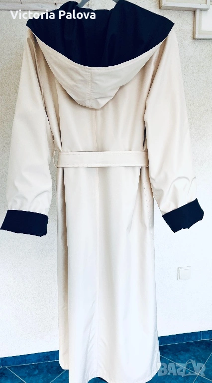 Изключително елегантен и впечатляващ дамски тренч / палто-тренч с двулицев дизайн от марката Kiss. Моделът е нов и се отличава с разкошна изработка и много гладка, плътна материя, която пада красиво и придава усещане за истинско качество и стил. Тренчът е създаден така, че може да се носи от двете страни, което го прави едновременно практичен и оригинален – от едната страна е в елегантен светъл бежов нюанс с тъмна качулка и маншети, а от другата е в наситен тъмен цвят със светла яка и колан. Силуетът е дълъг и много стилен, с колан, който подчертава талията, удобни джобове и качулка, а маншетите могат да се подгъват според предпочитанието, което позволява регулиране на дължината на ръкава. Тренчът впечатлява с изискан външен вид и универсален дизайн, който лесно се съчетава както с ежедневни, така и с по-елегантни визии. Произход Германия, изработка с отлично качество и внимание към детайла, рядък и много красив модел, който се откроява и придава класа на всяка визия. Размери: рамо 44 см, гръдна ширина 58 см, ханш 59 см, дължина 130 см, ръкав 69 см.