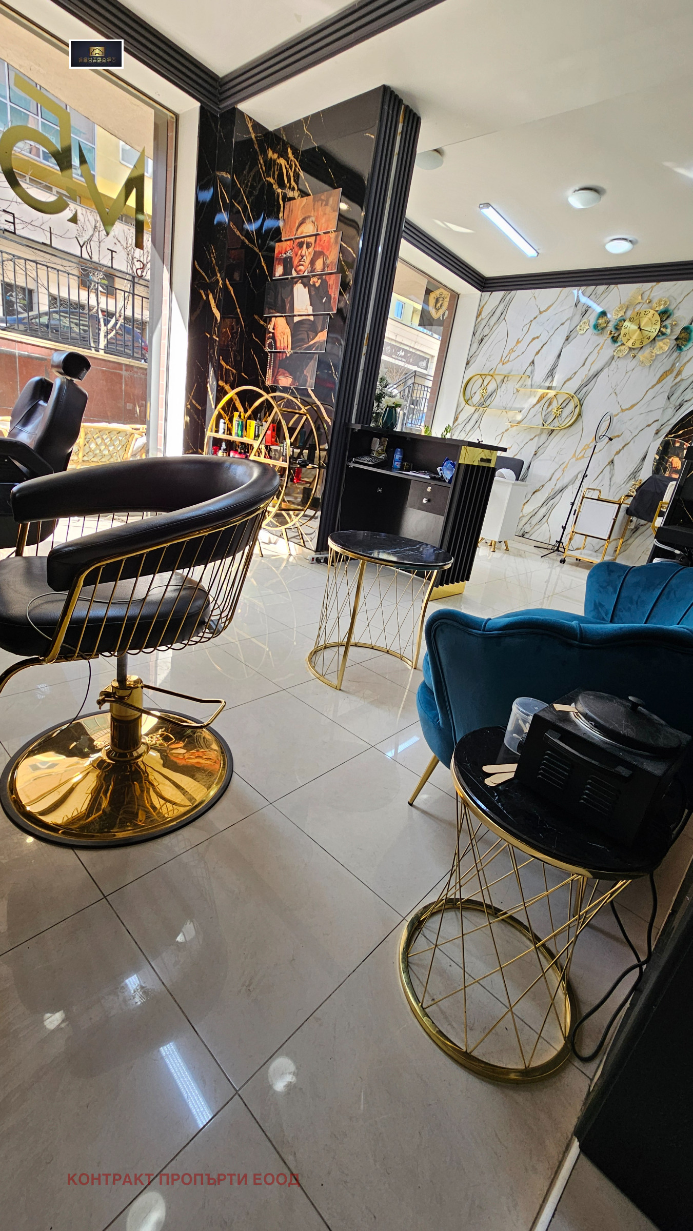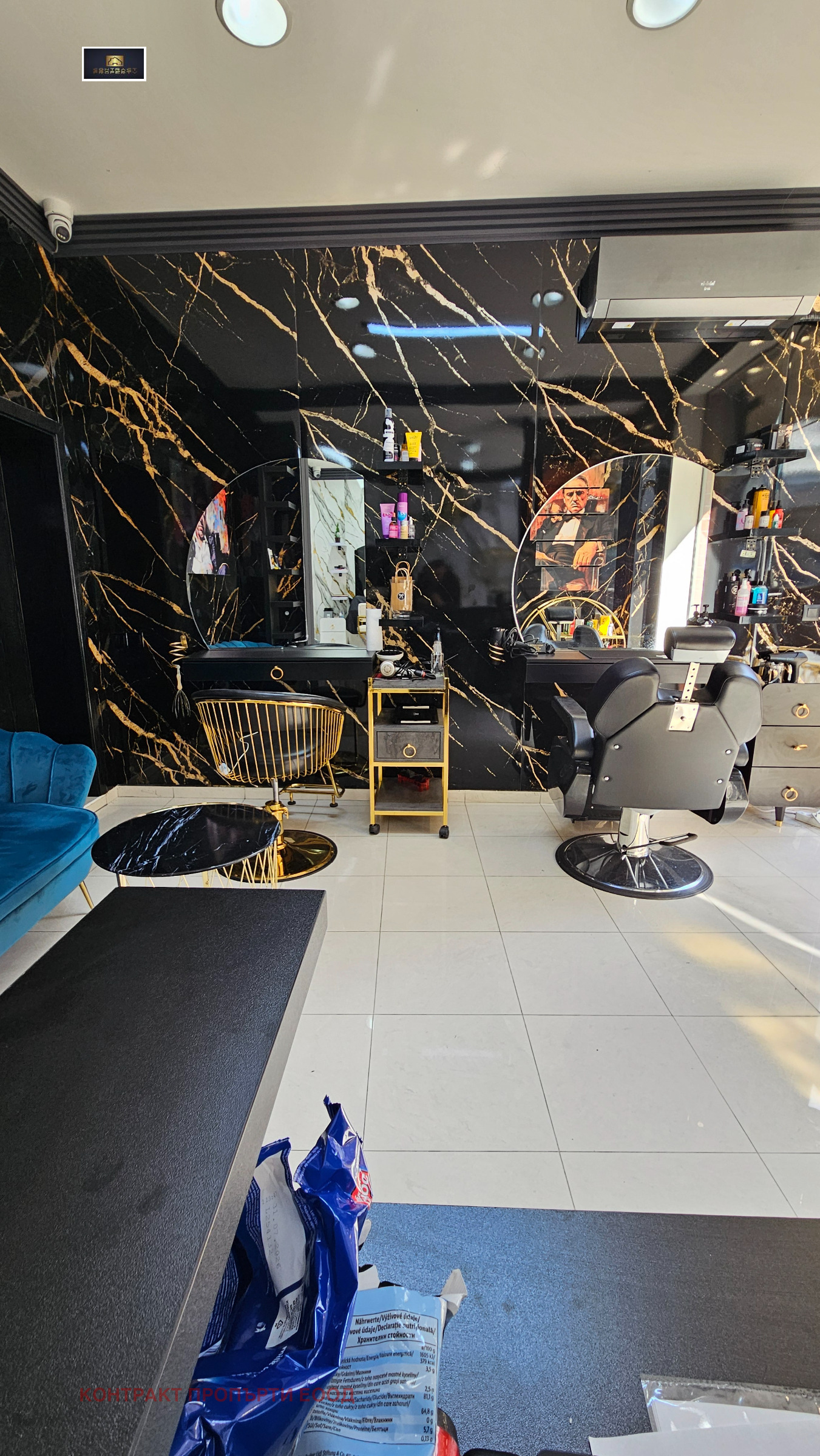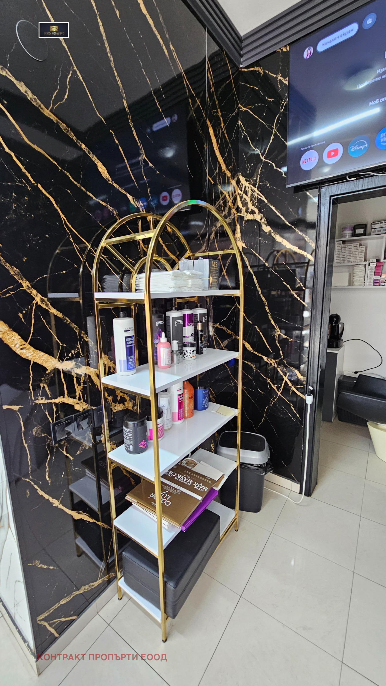 Салонът е оборудван с професионално обзавеждане, включително видеонаблюдение, телевизор, хидравличен регулируем фризьорски стол, хидромасажен стол, измивна колона и допълнително оборудване, необходимо за пълноценна работа.