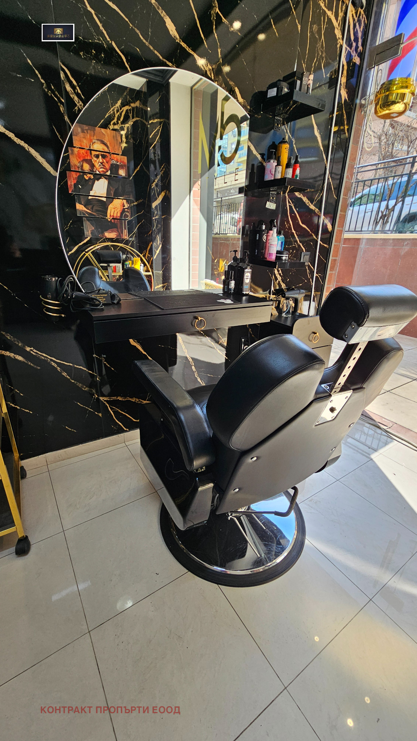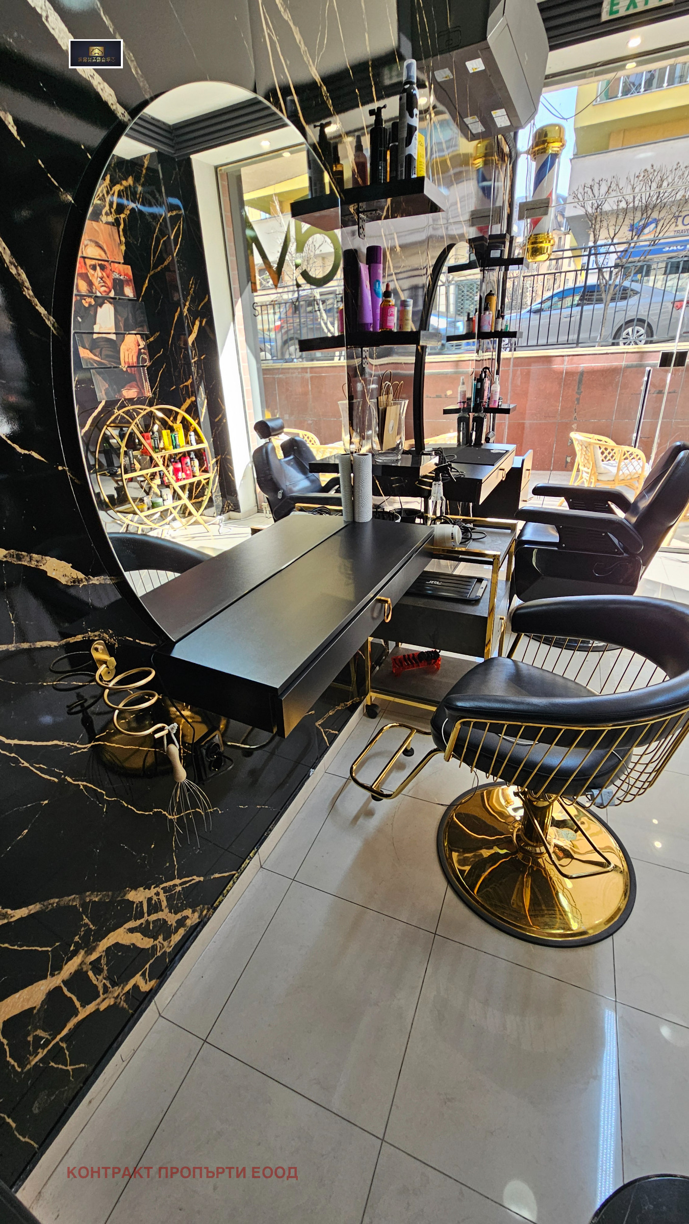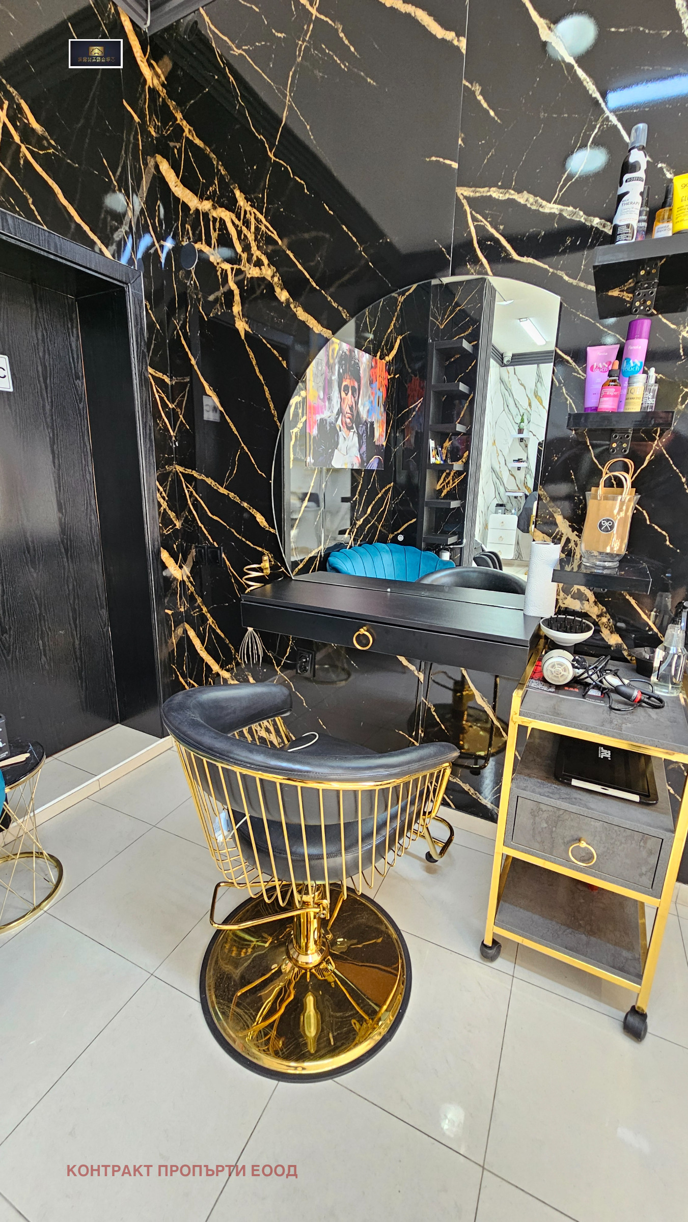 Салонът е оборудван с професионално обзавеждане, включително видеонаблюдение, телевизор, хидравличен регулируем фризьорски стол, хидромасажен стол, измивна колона и допълнително оборудване, необходимо за пълноценна работа.